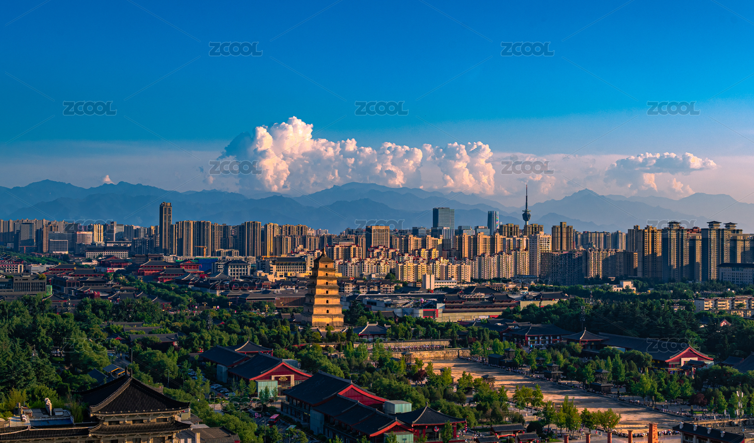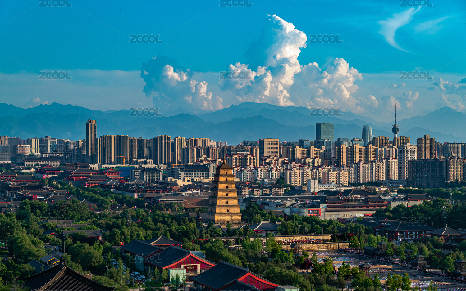 夏日晴空傍晚前的西安天際線大雁塔及廣播塔