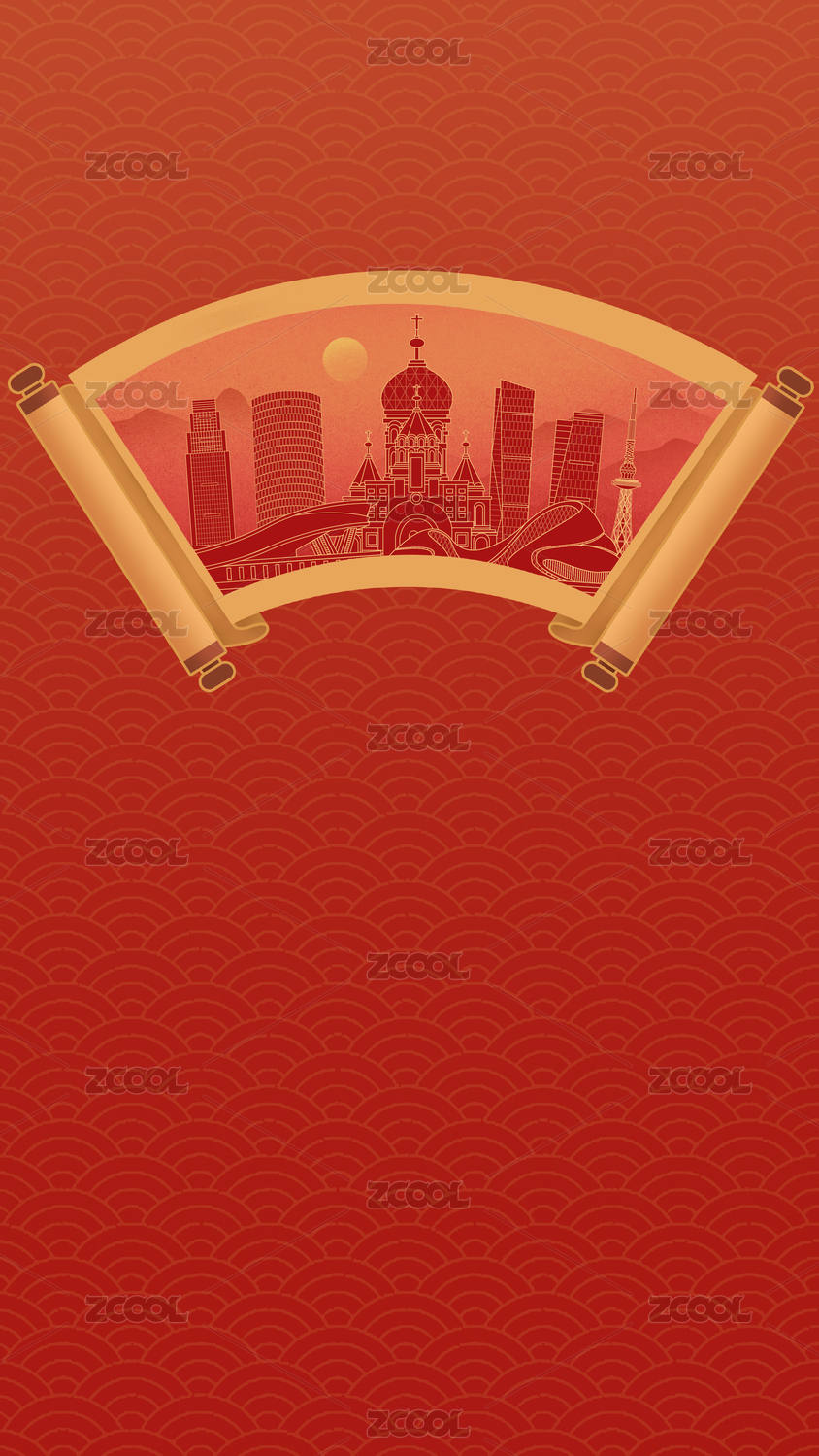 中國(guó)哈爾濱中國(guó)風(fēng)畫卷古典卷軸書卷城市建筑