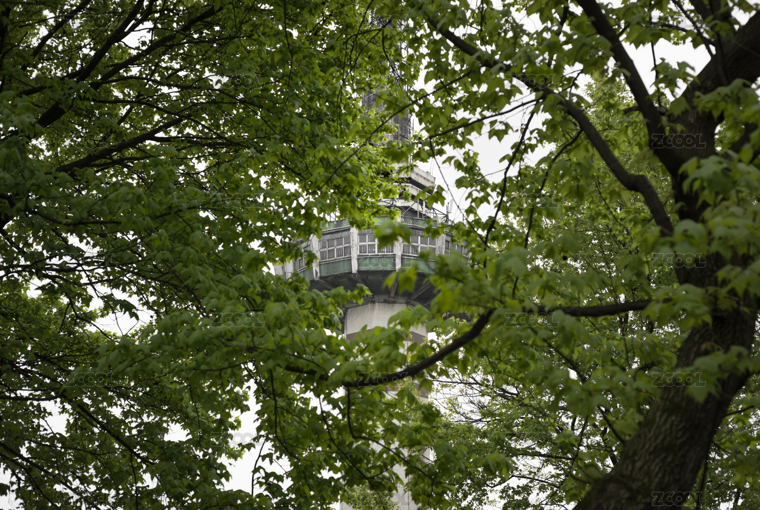 春天隱藏在樹(shù)枝樹(shù)葉后的廣播塔發(fā)射塔