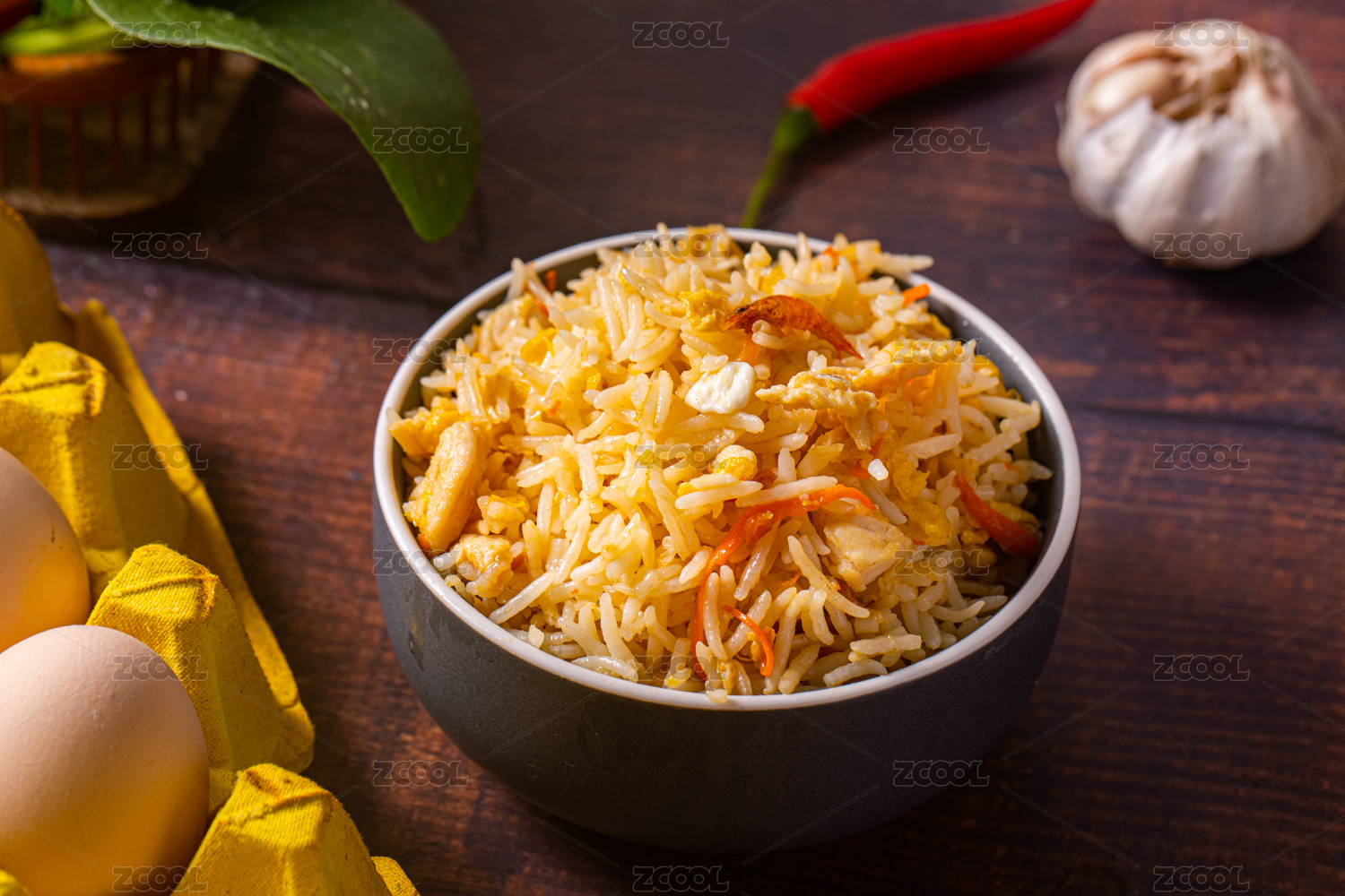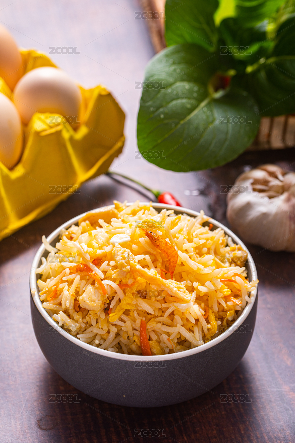 裝在碗里放在桌子上的長粒香米蛋炒飯
