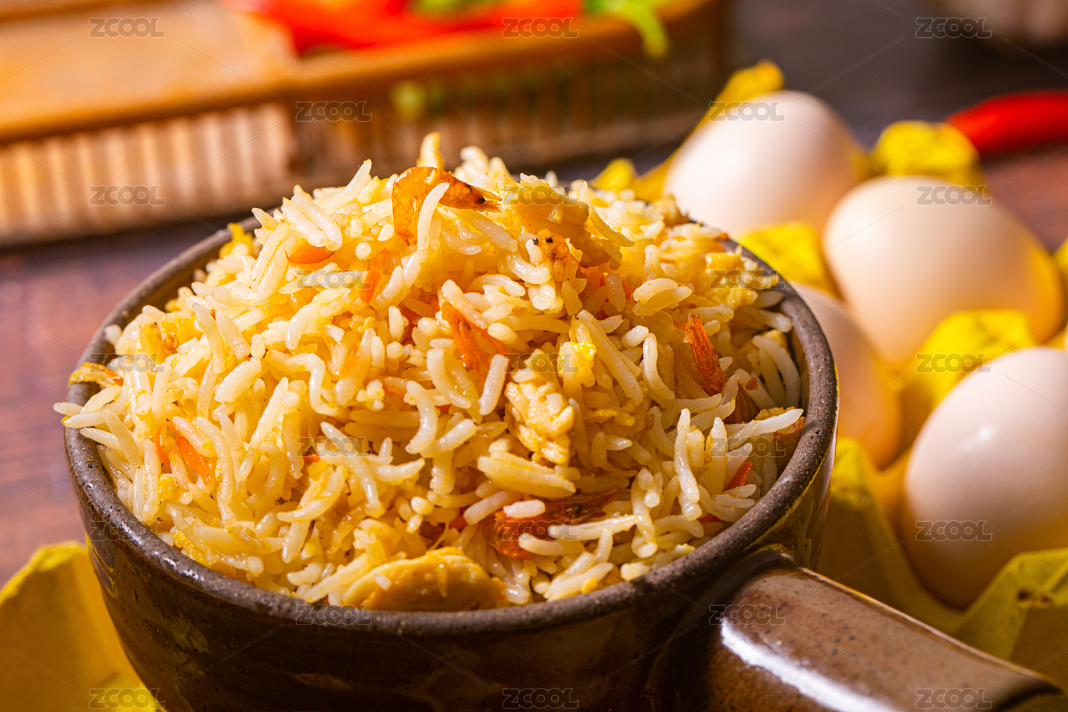 裝在陶鍋里放在桌子上貓牙米蛋炒飯