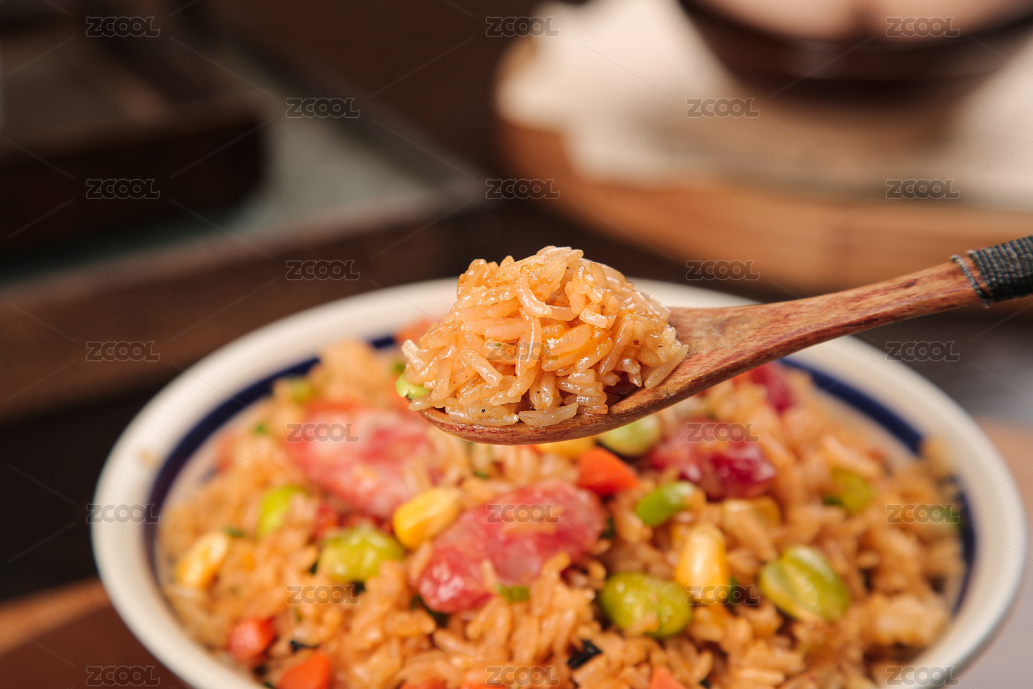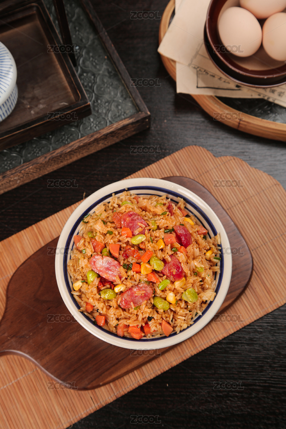傳統(tǒng)中式背景中裝在碗里放在桌子上的蛋炒飯