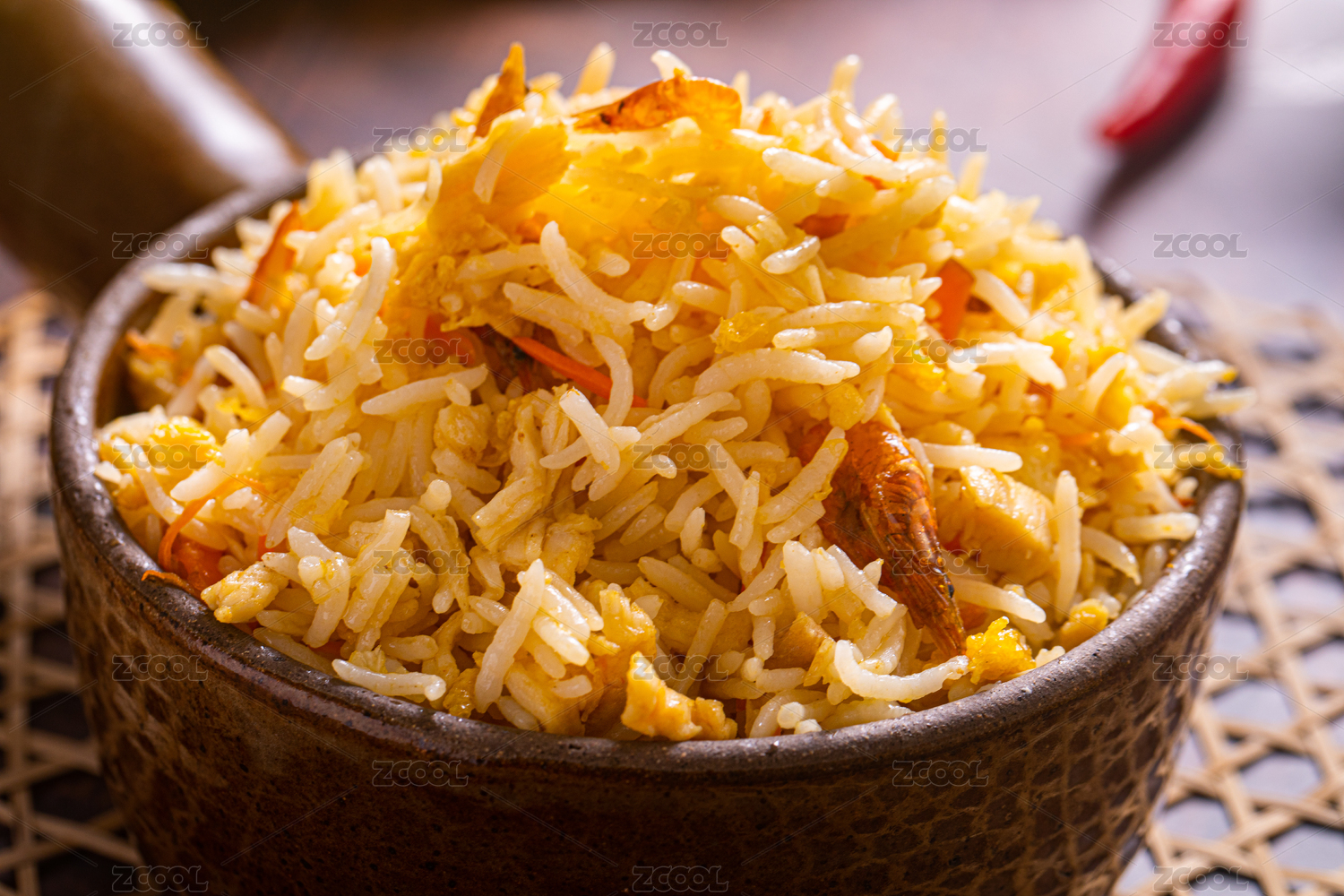 裝在陶鍋里放在桌子上的印度香米蛋炒飯