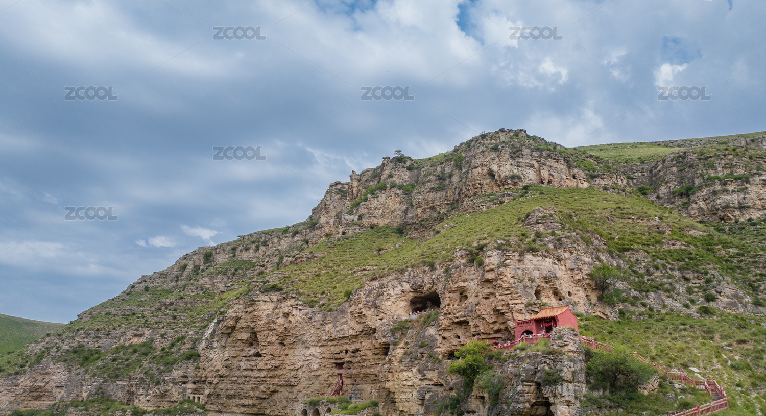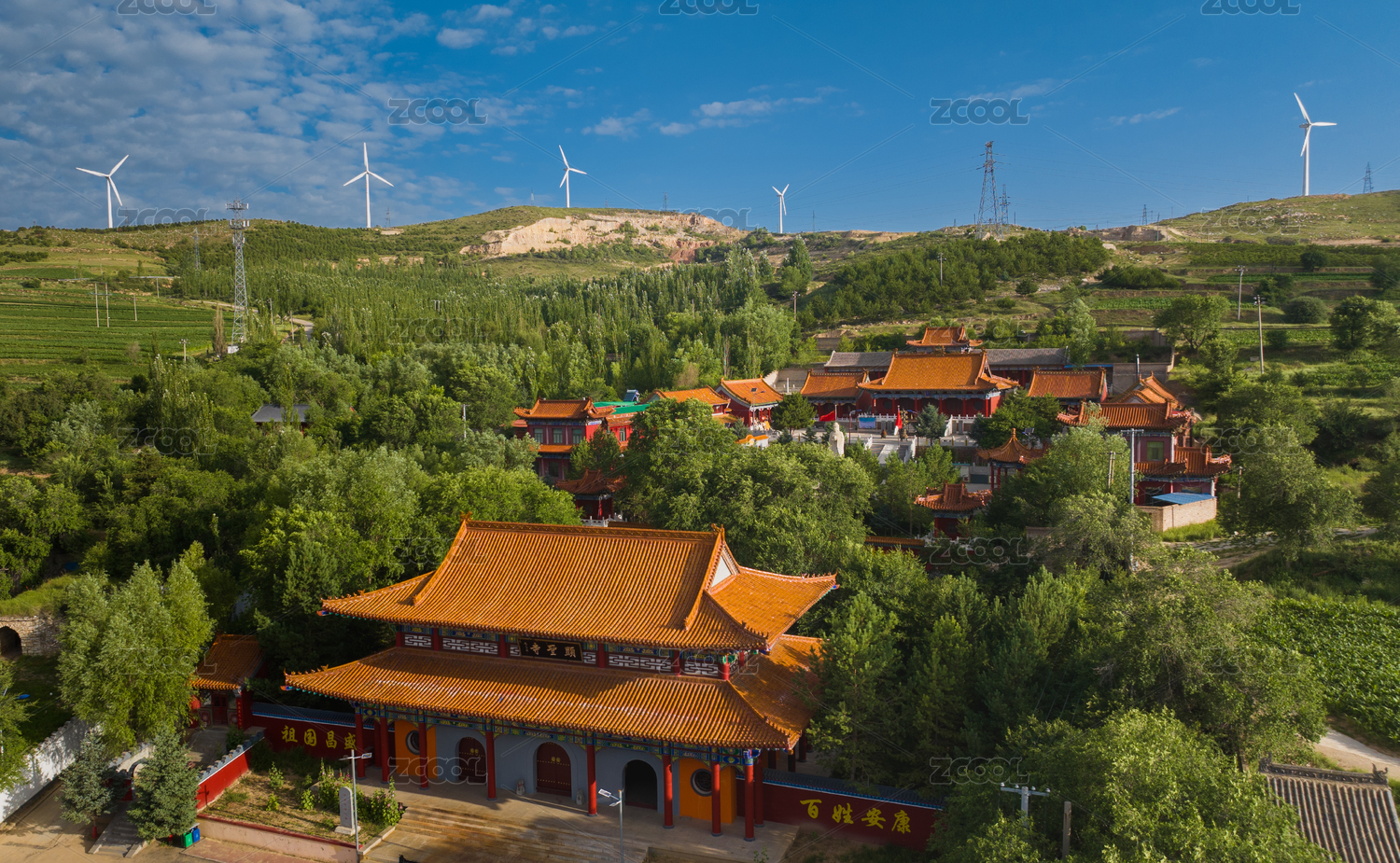 藍(lán)天白云下山西省神池縣顯圣寺全景