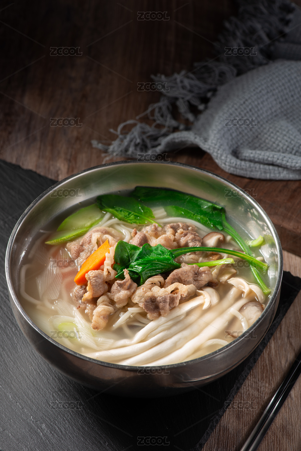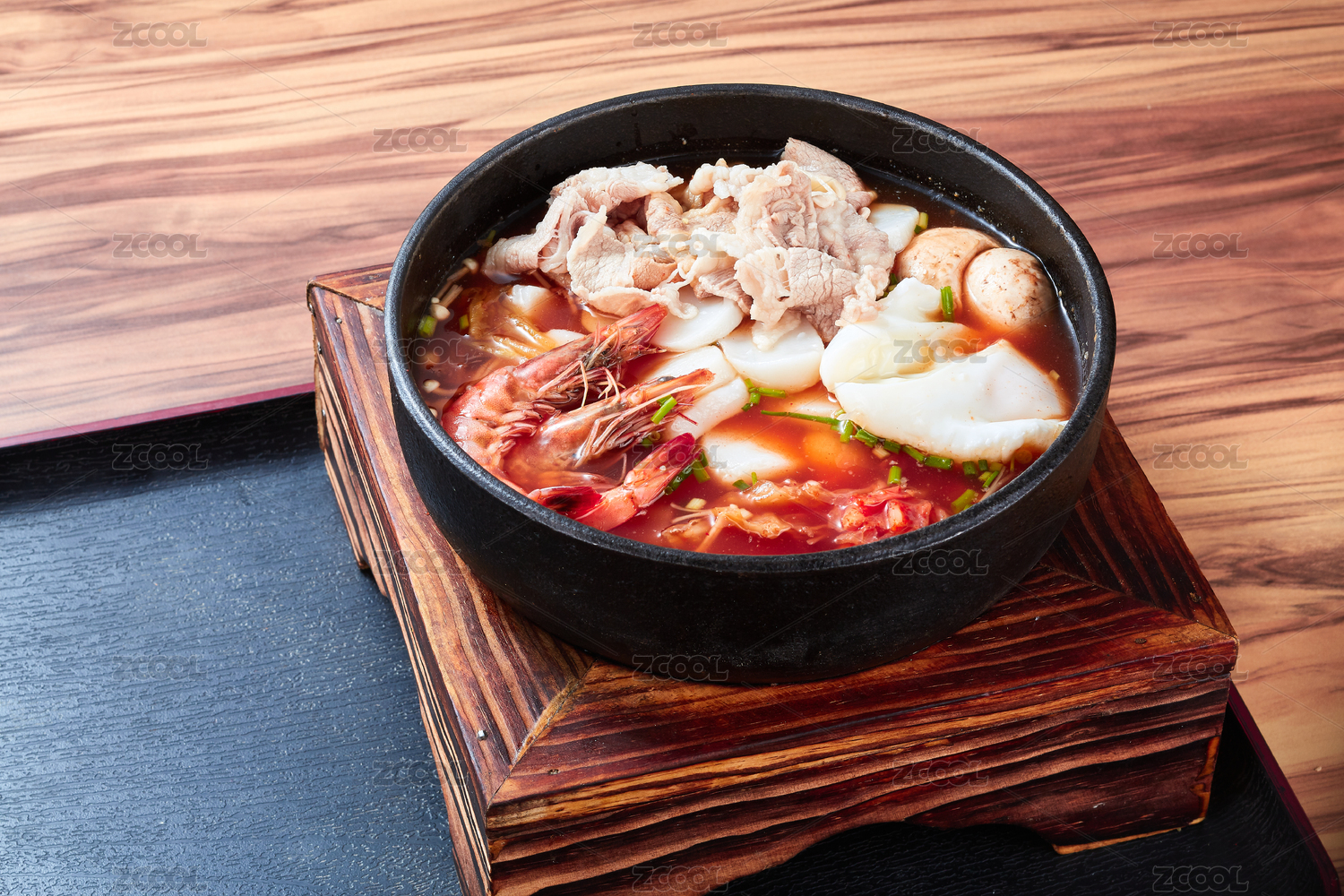 一碗石鍋中的美味日式海鮮牛肉烏冬面在木質(zhì)托盤上