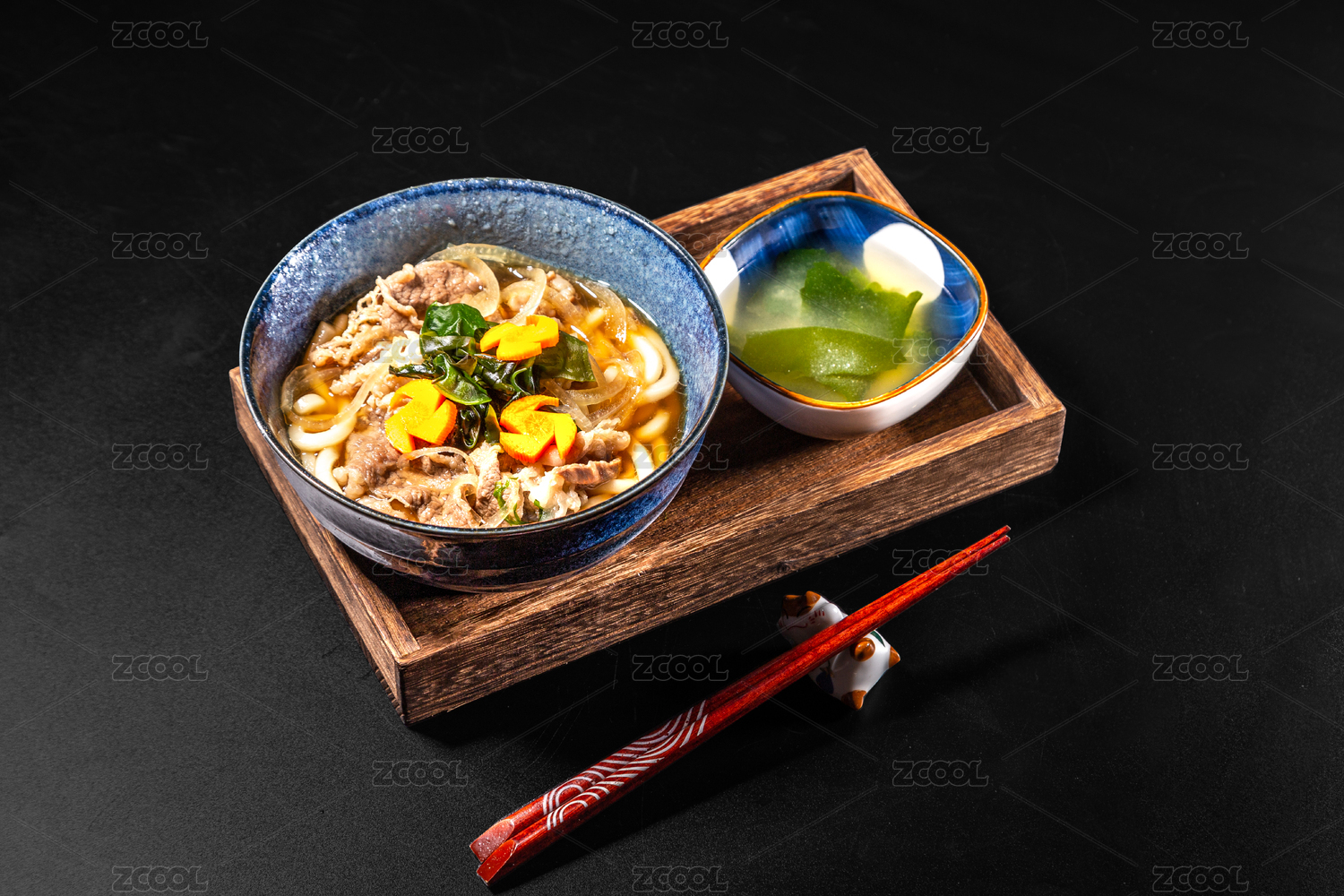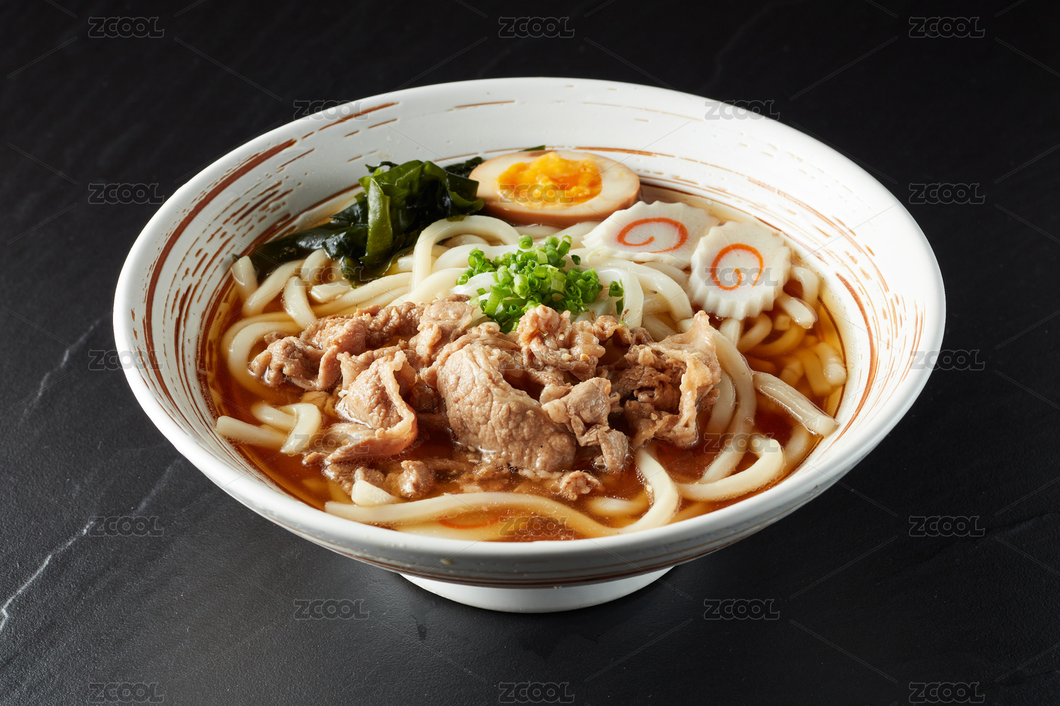 黑色桌面上有一份牛肉烏冬面