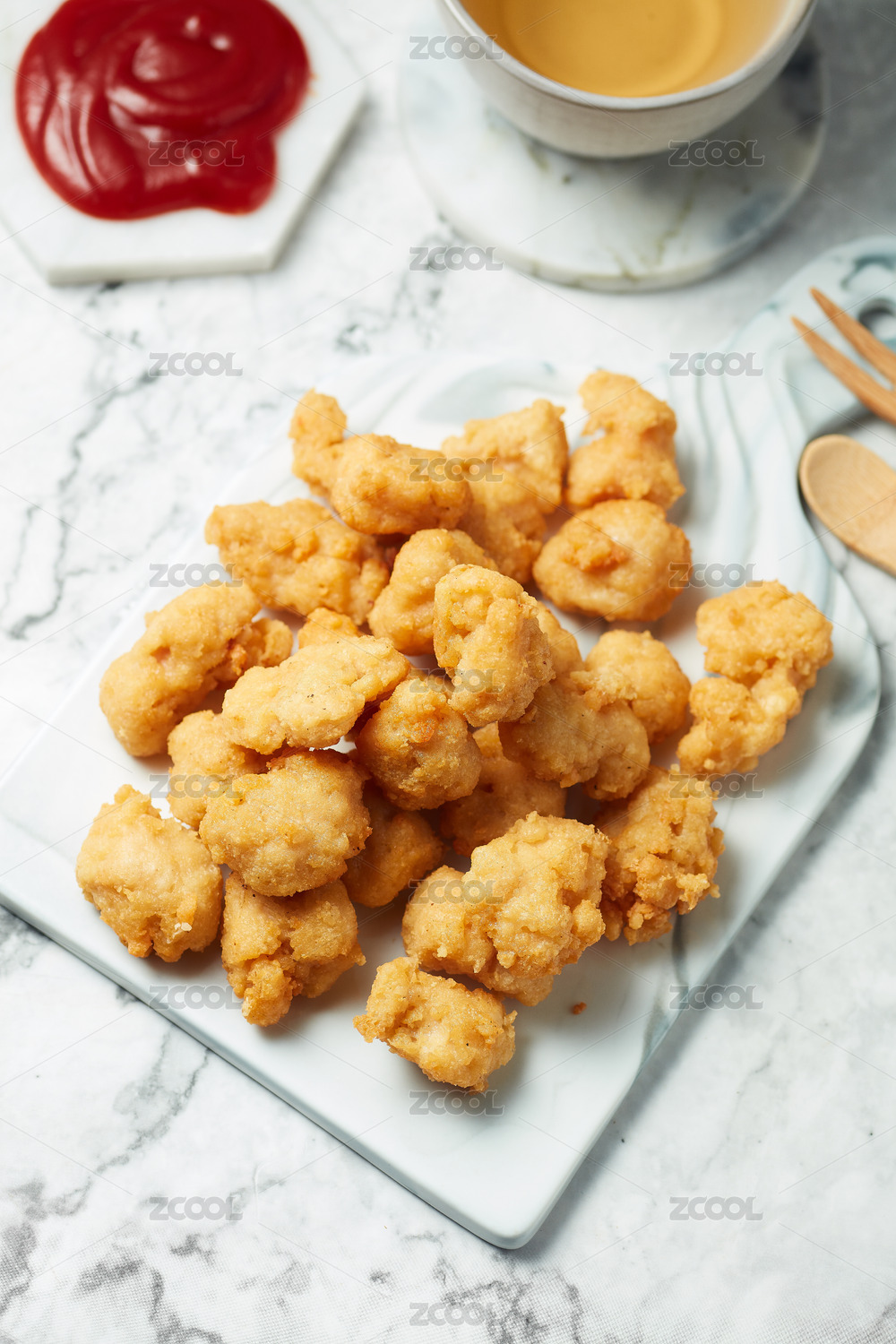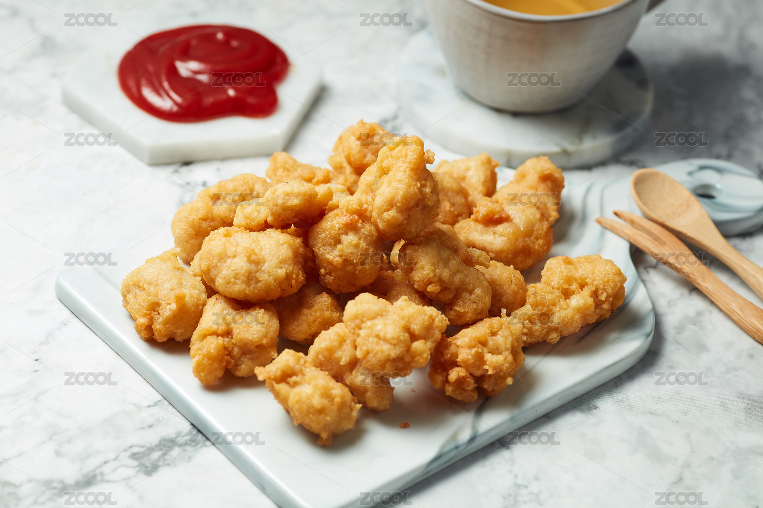 純白色背景下金黃色的雞米花