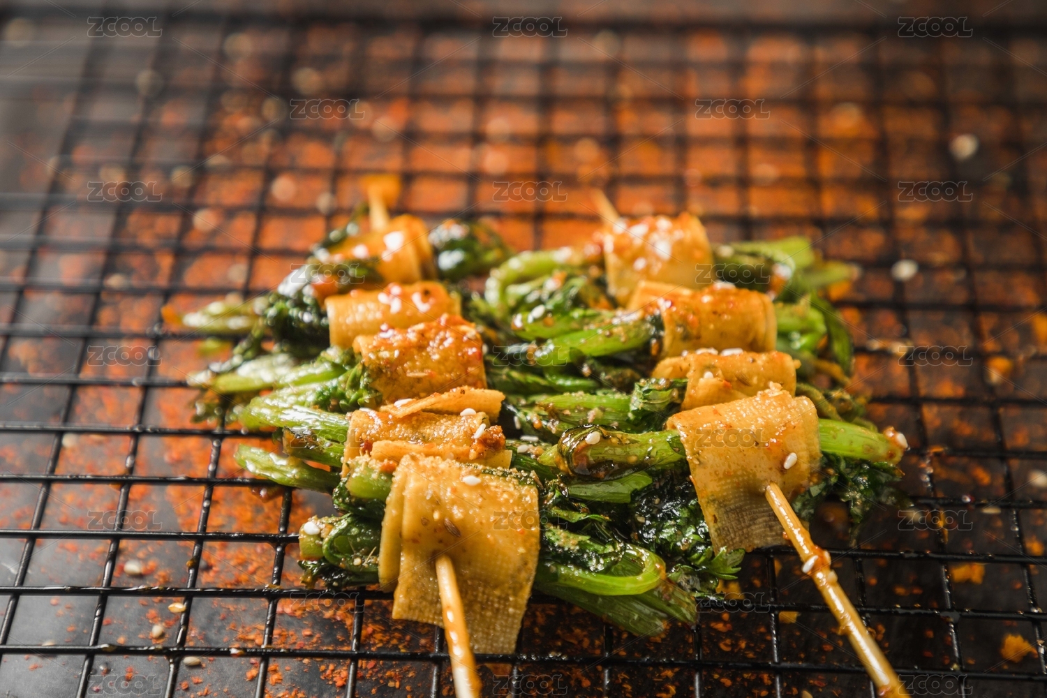 黑色烤架上放著幾串撒著辣椒面的油炸干豆腐素串