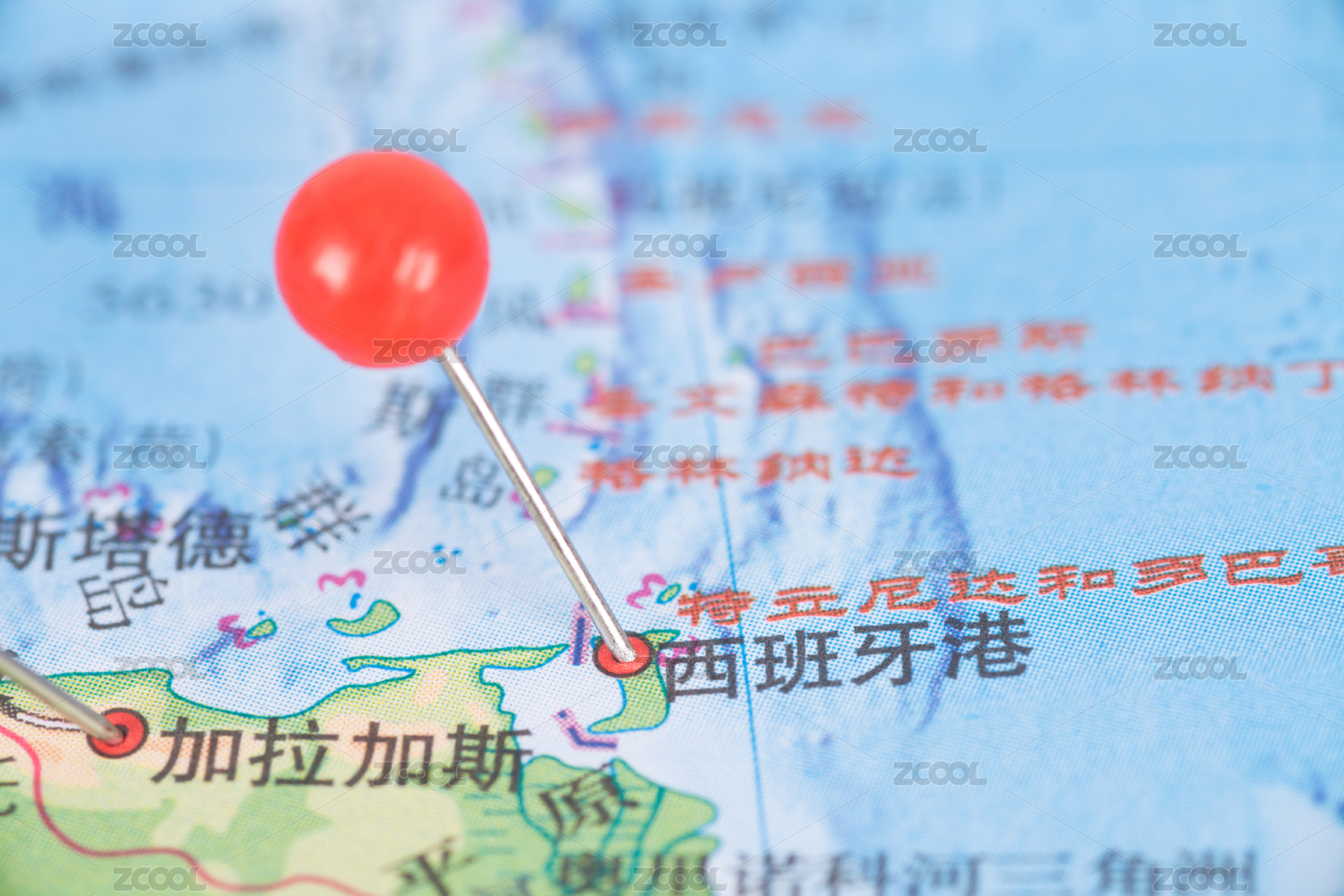 一枚大頭釘在地圖上標(biāo)注特立尼達(dá)和多巴哥首都西班牙港的位置