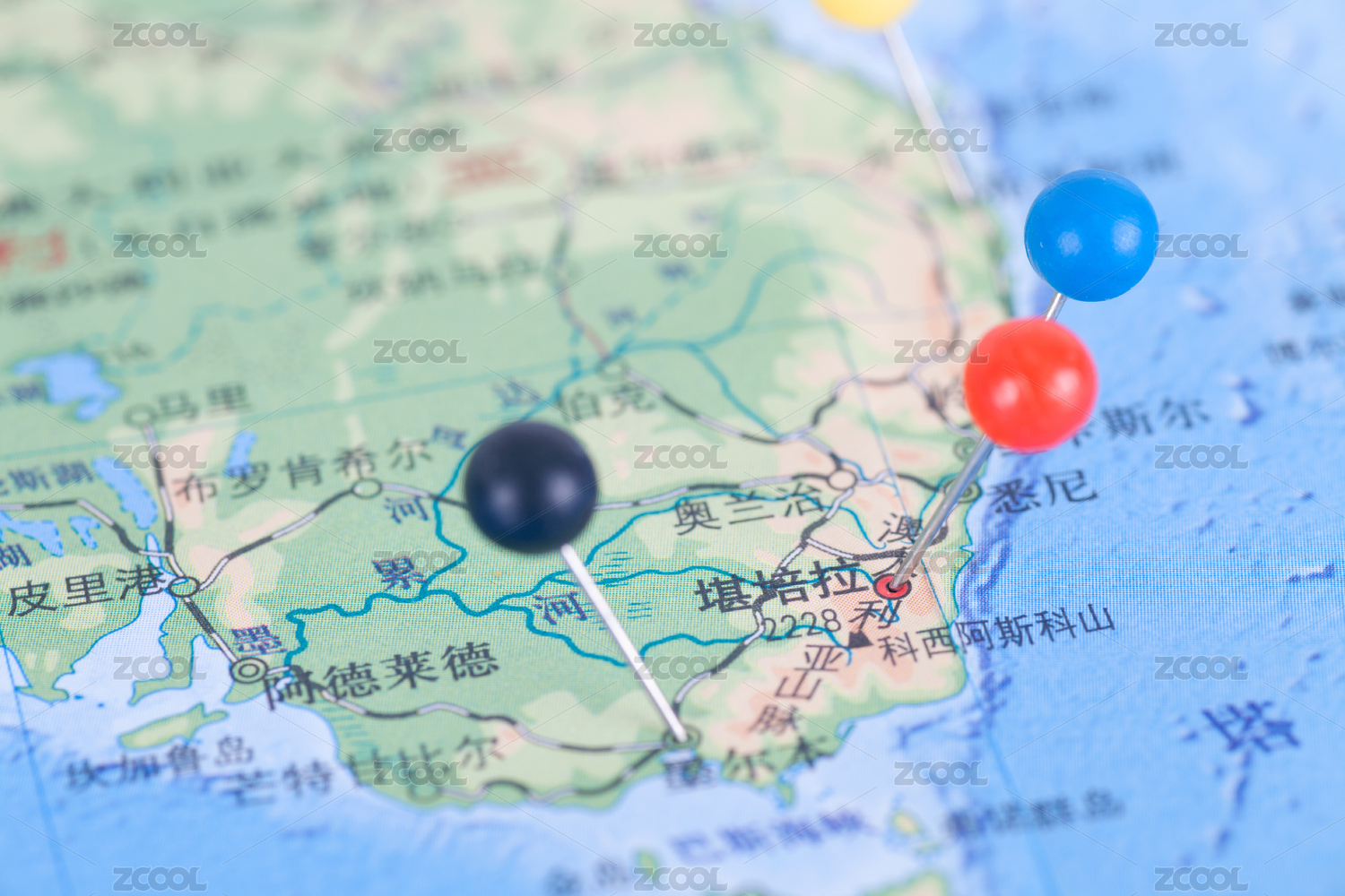 一枚大頭釘在地圖上標(biāo)注澳大利亞首都堪培拉的地理位置