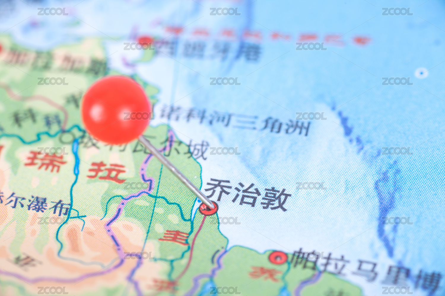 一枚大頭釘在地圖上標(biāo)注圭亞那首都喬治敦的位置