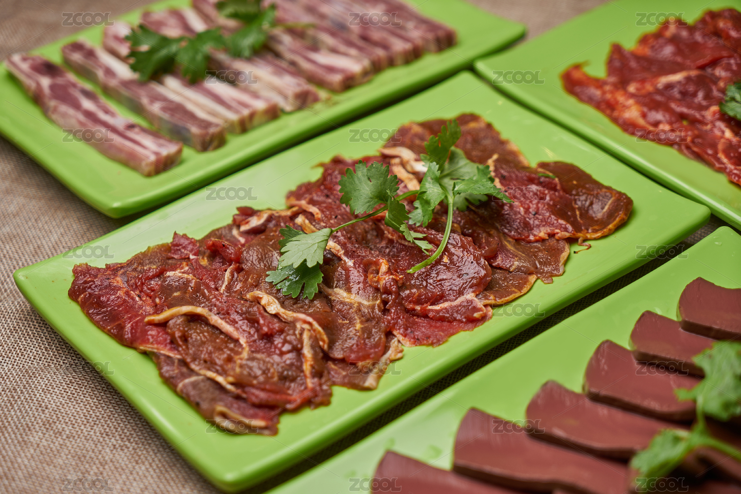 美味營養(yǎng)的火鍋菜牛肉片擺放在綠色的方碟中