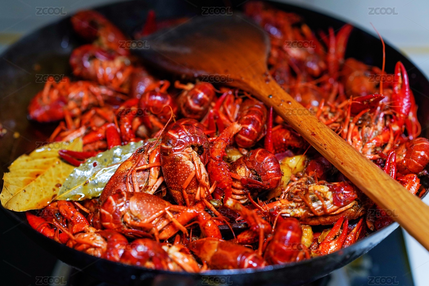 鍋里正在烹飪的麻辣小龍蝦特寫