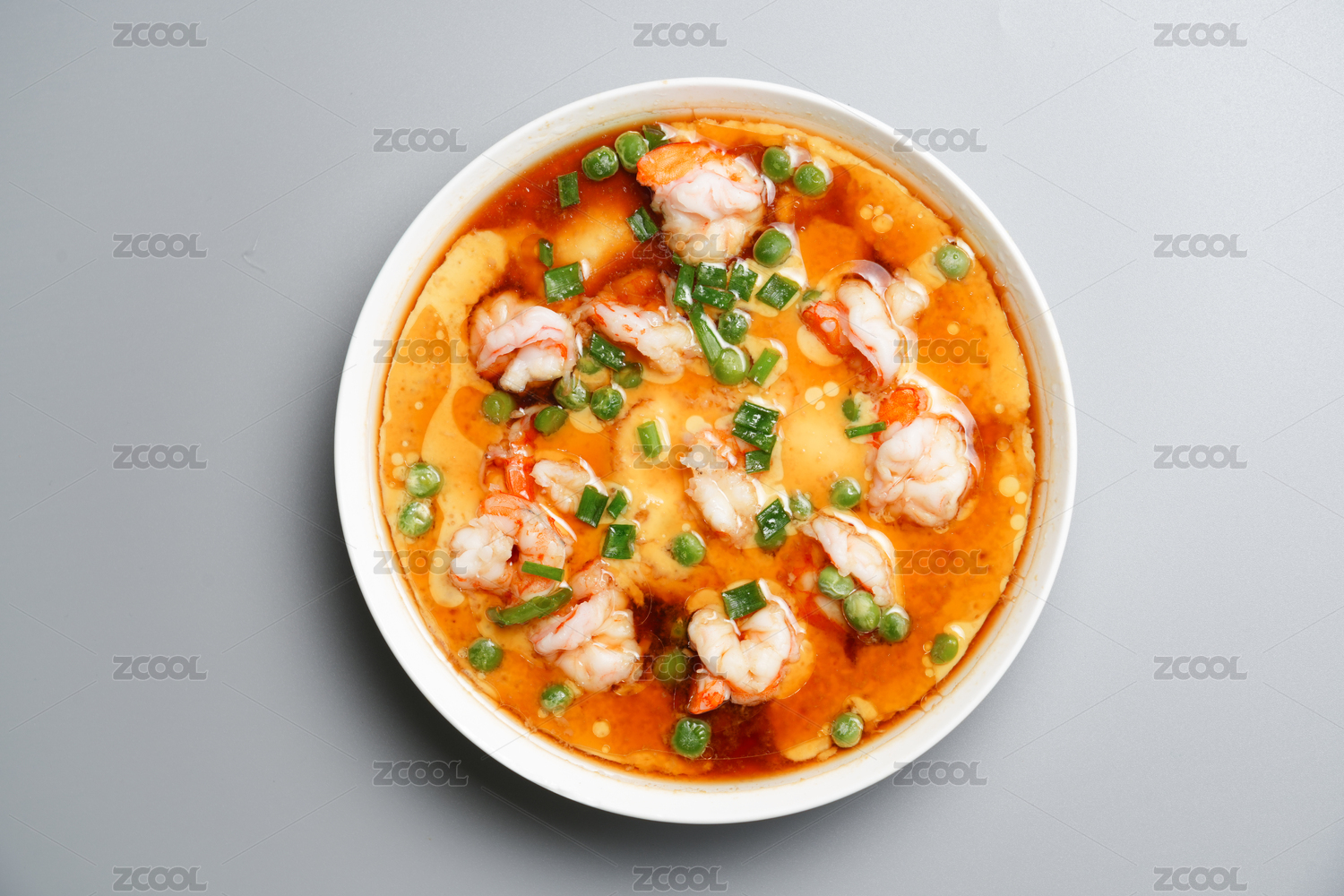一盤美味的蝦仁蒸蛋放在灰色背景上
