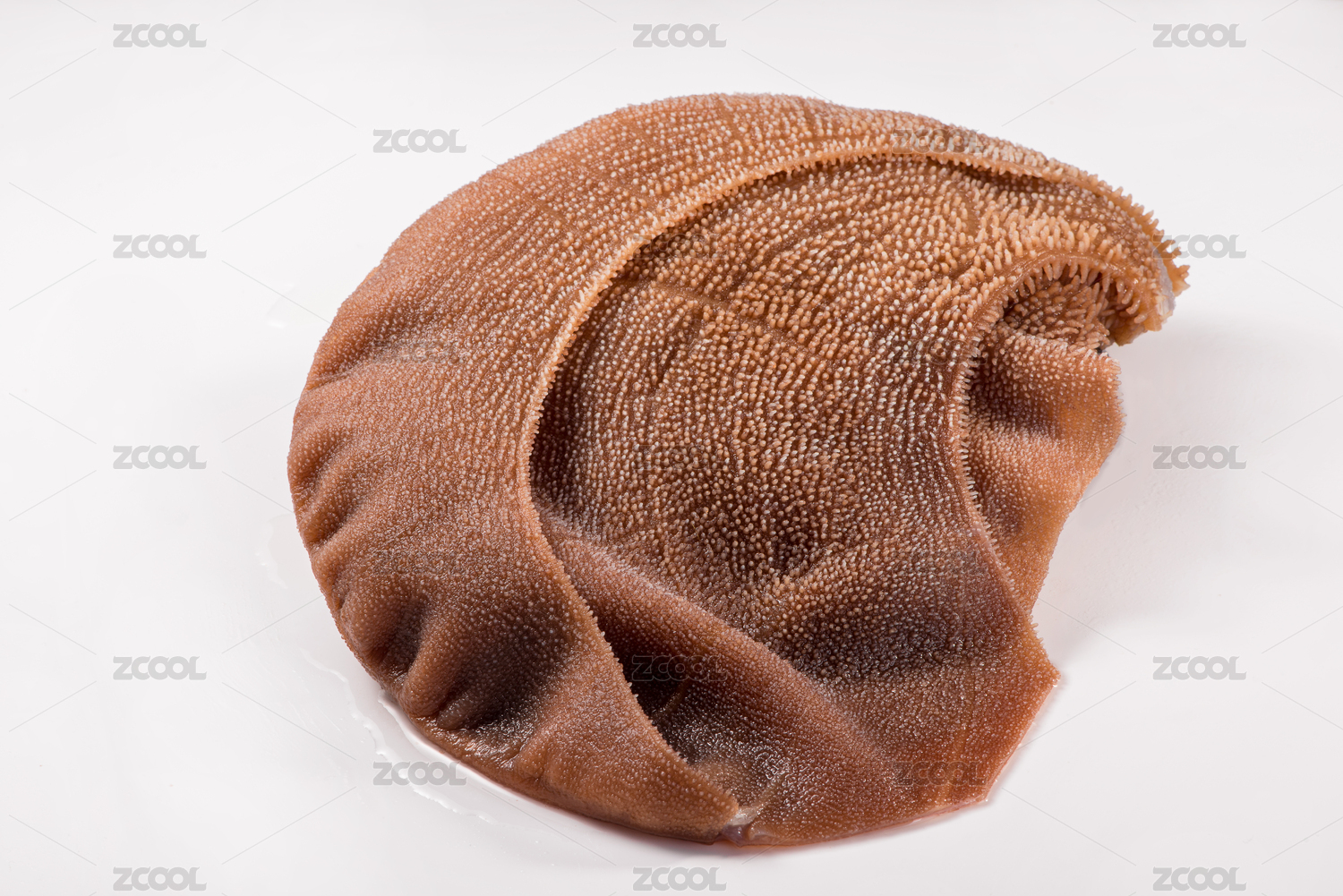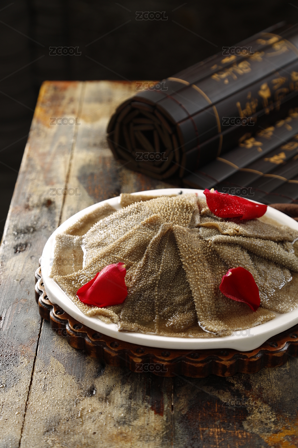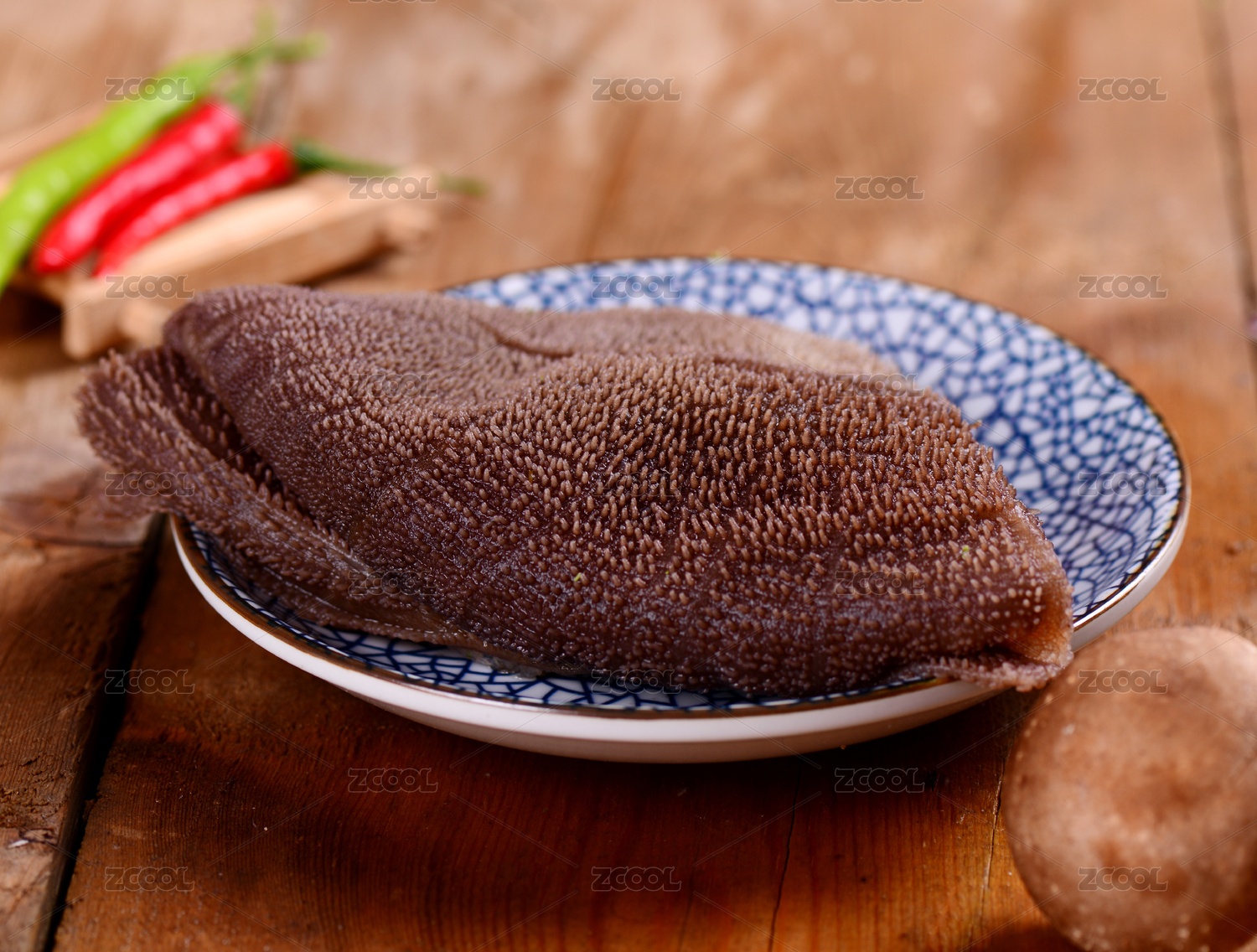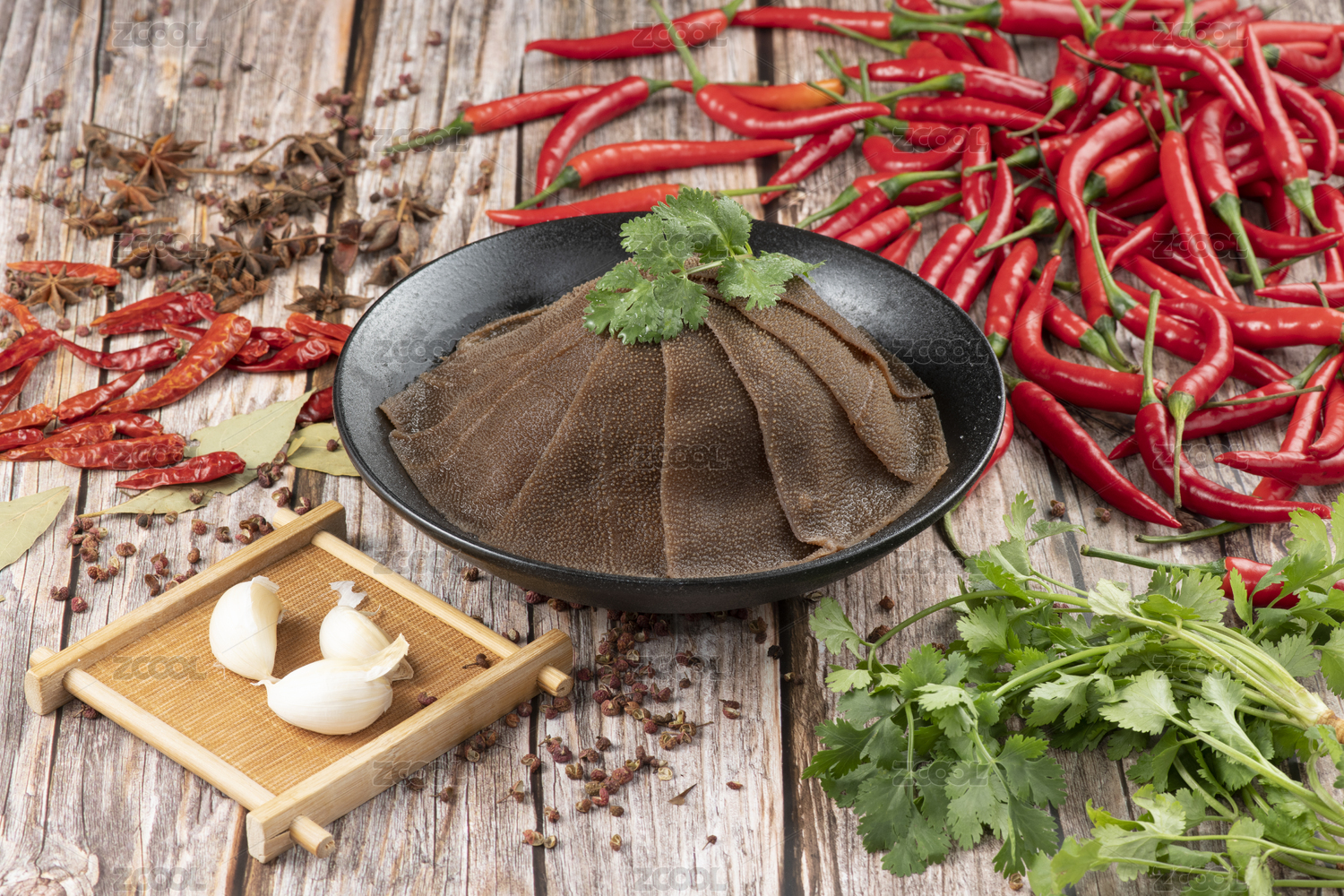 竹桌背景下藍(lán)色盤中的新鮮毛肚