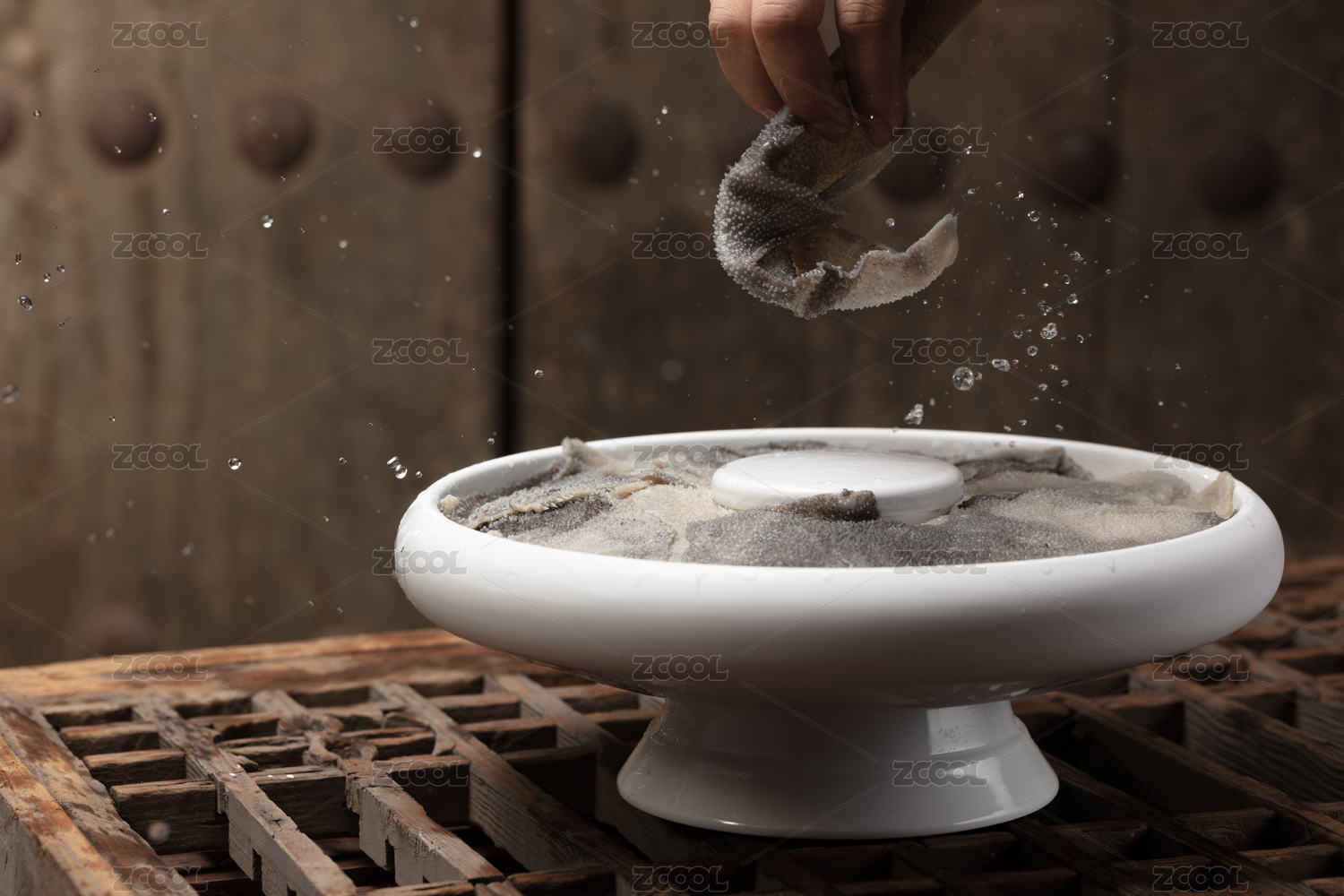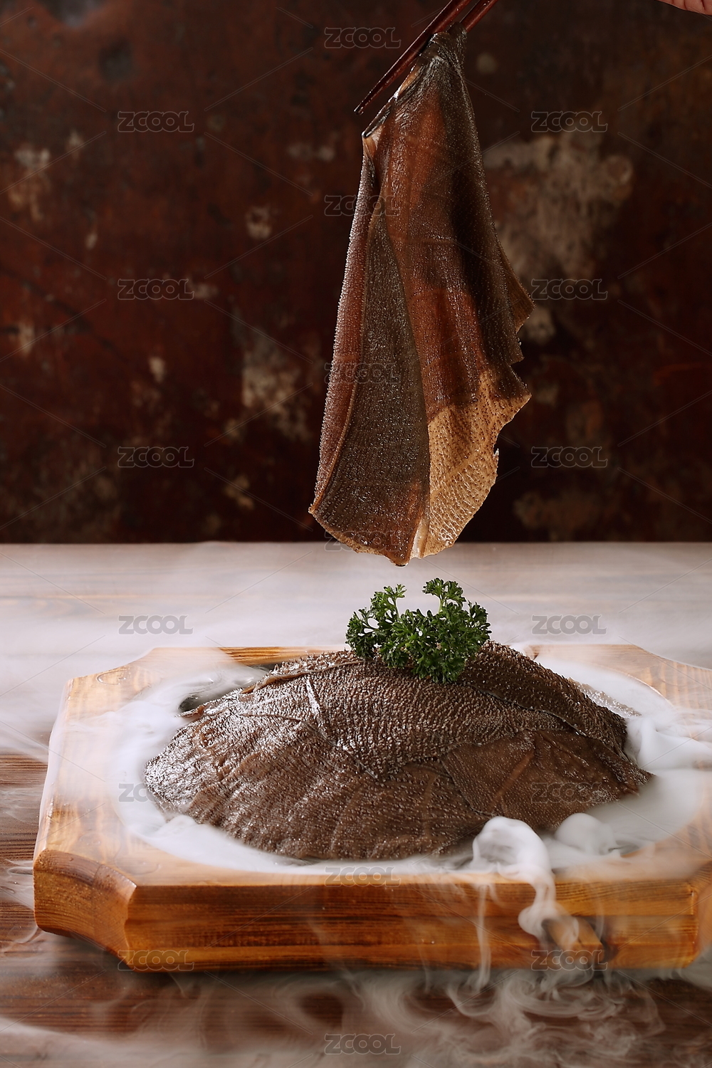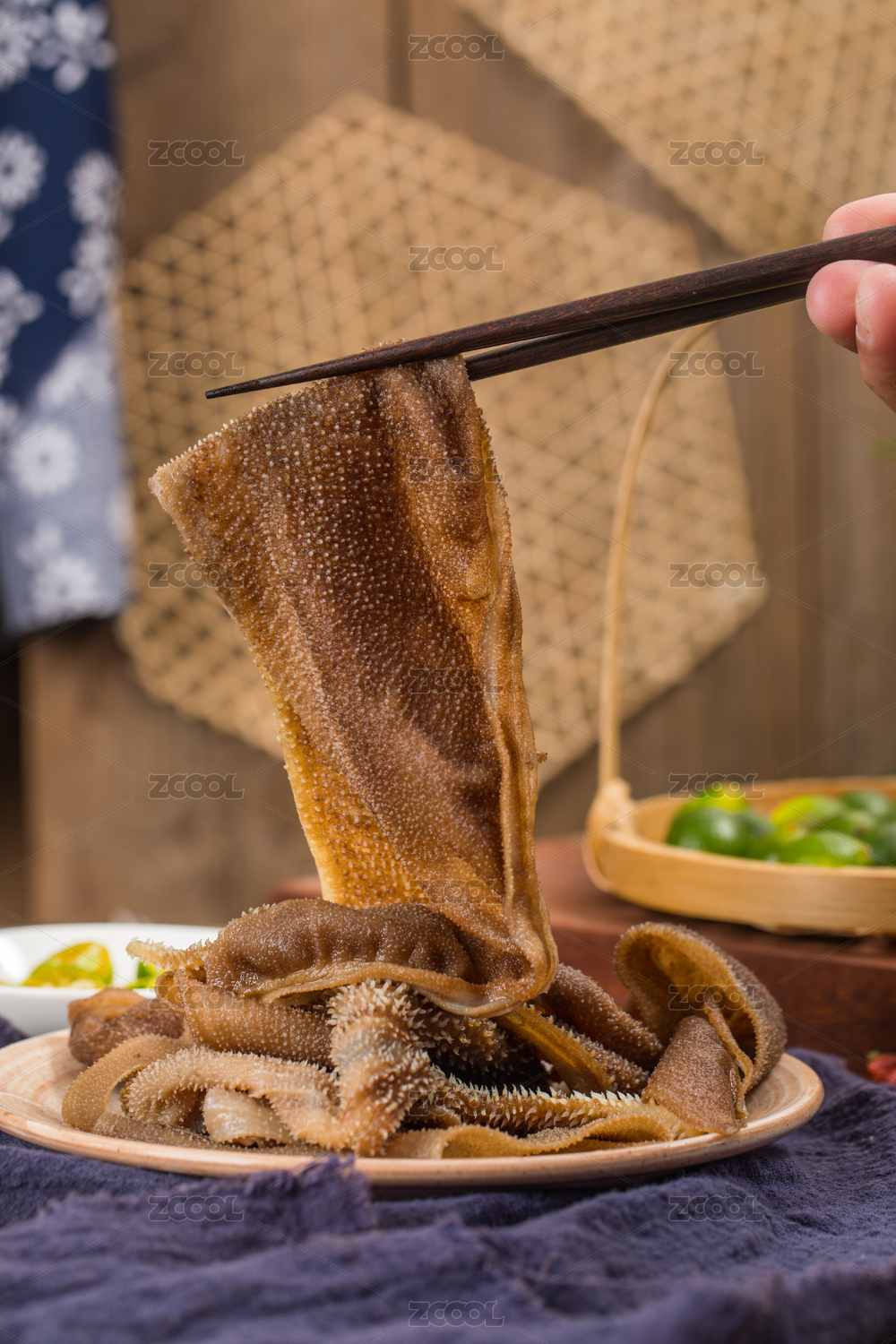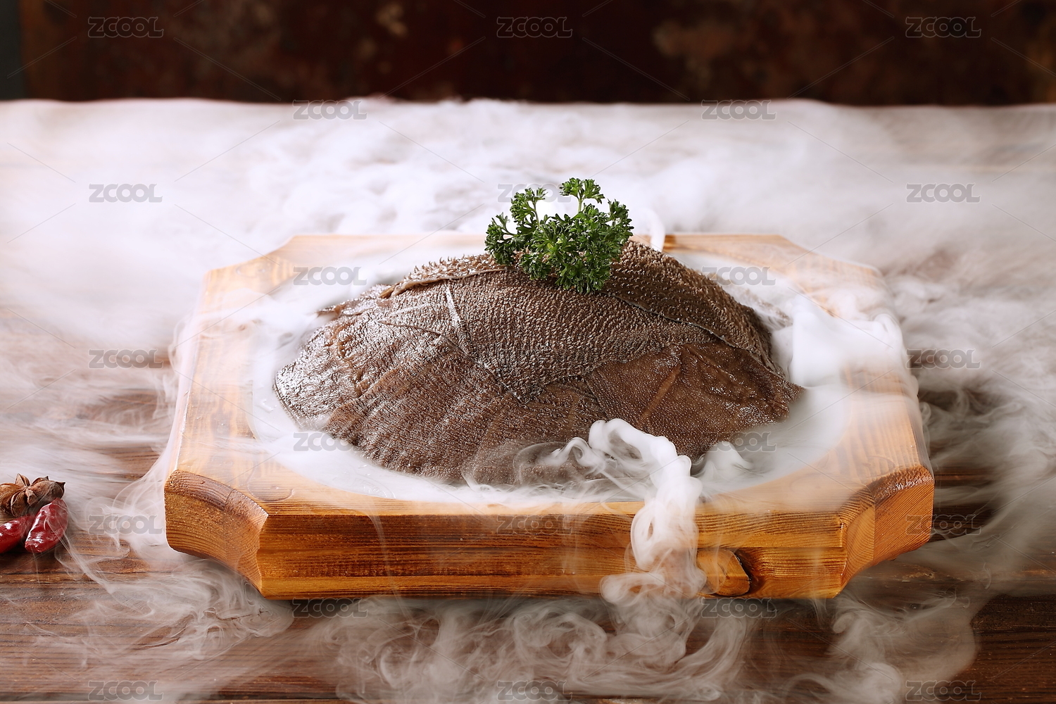竹桌背景下藍(lán)色盤中的新鮮毛肚