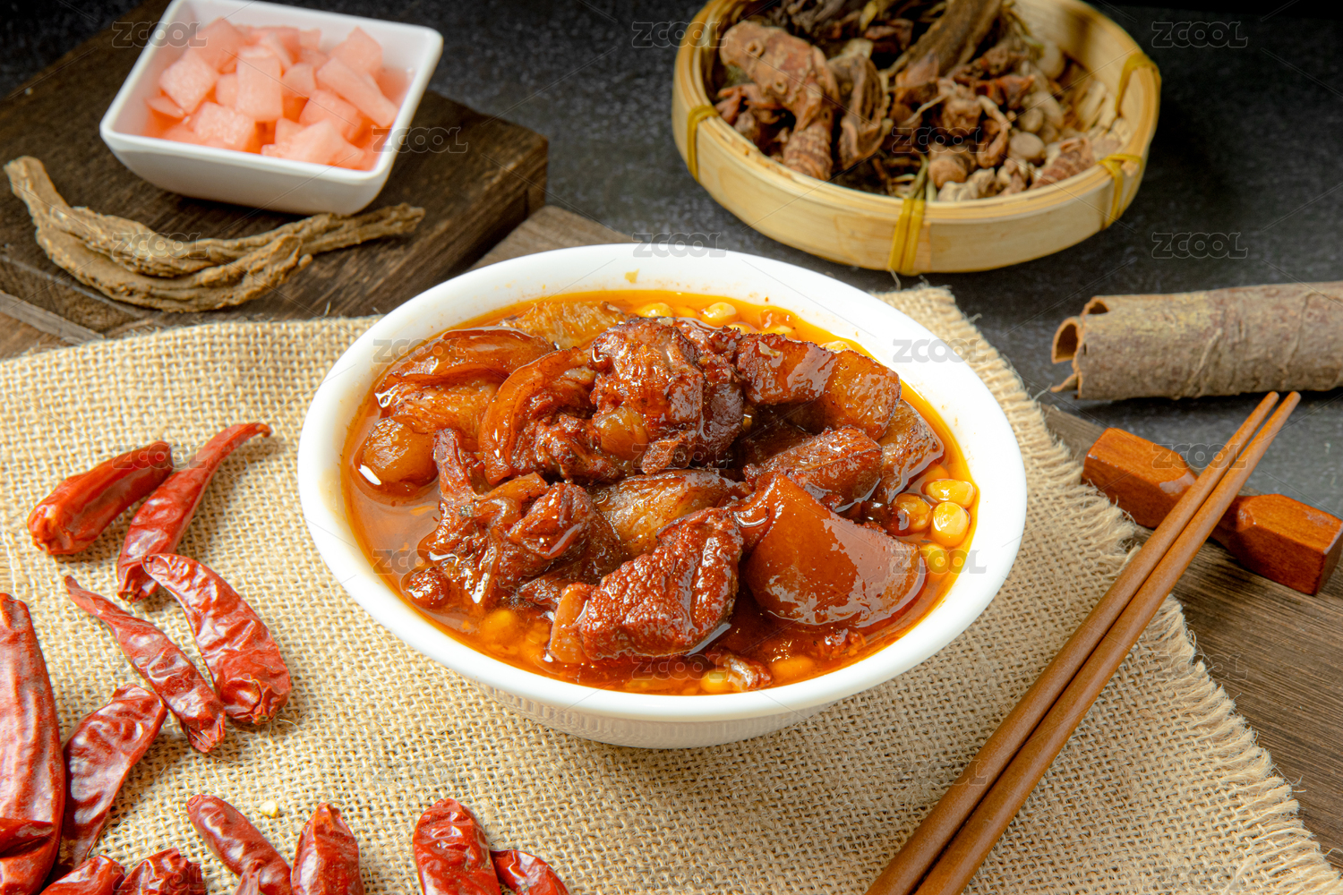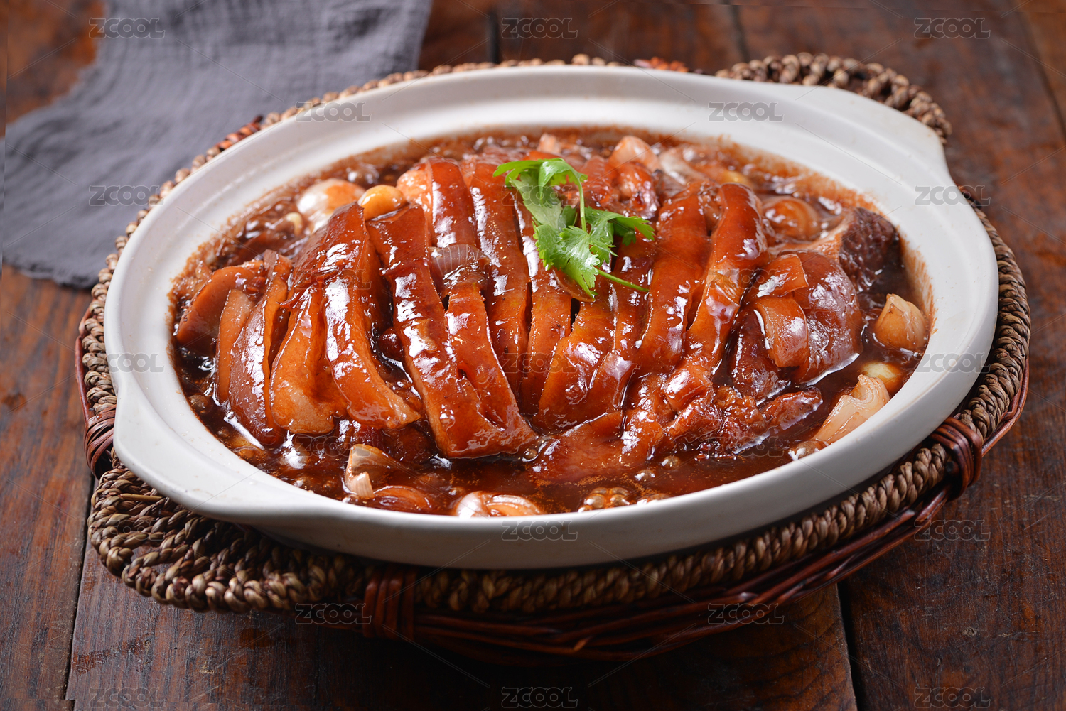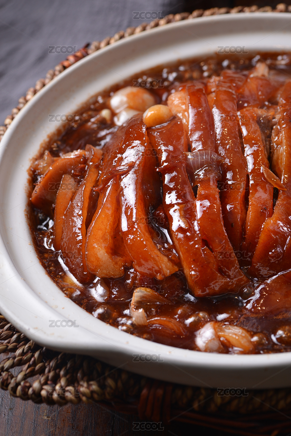 一盤燉肘子肉放在灰色底板上