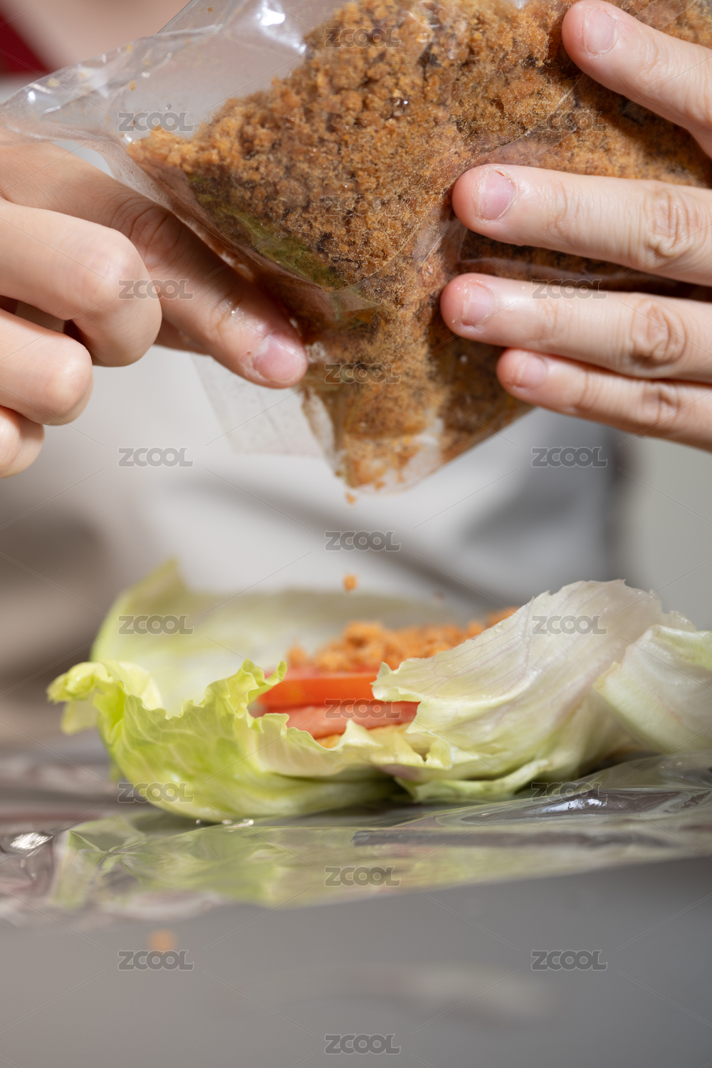 正在制作生菜卷手正將調(diào)味料撒在生菜上
