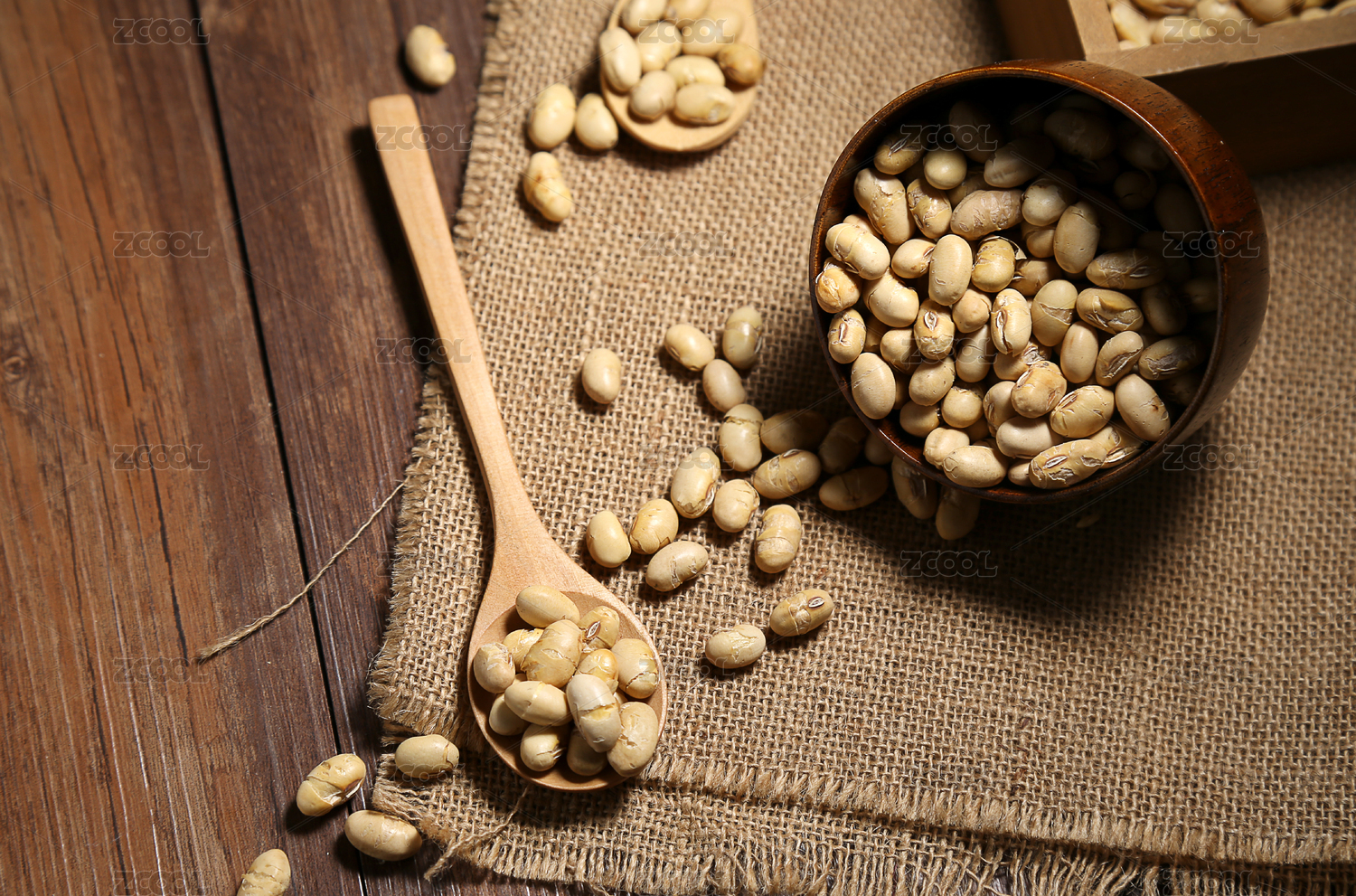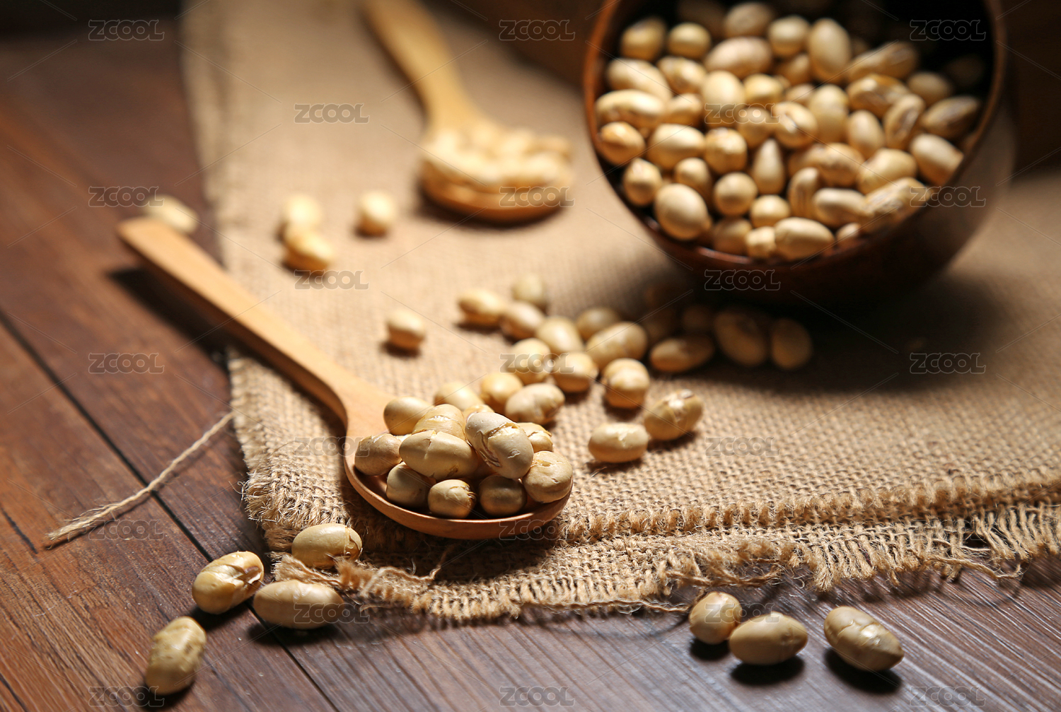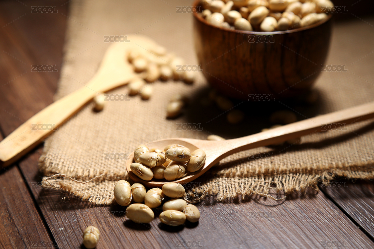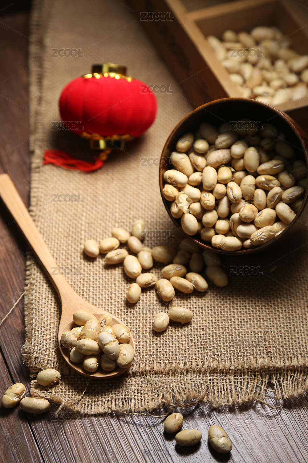 炒黃豆放在木碗和木勺里