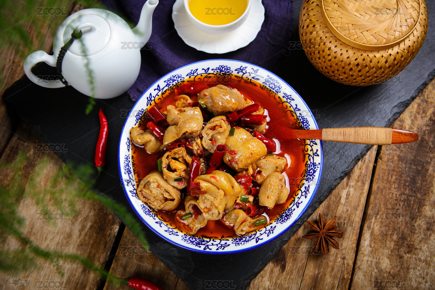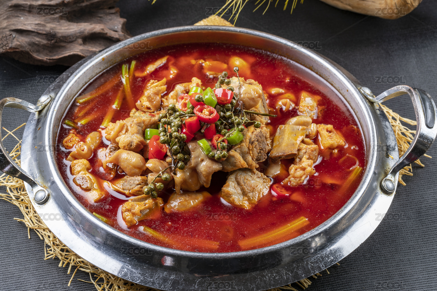 平底大盆里的麻辣水煮肥腸雞