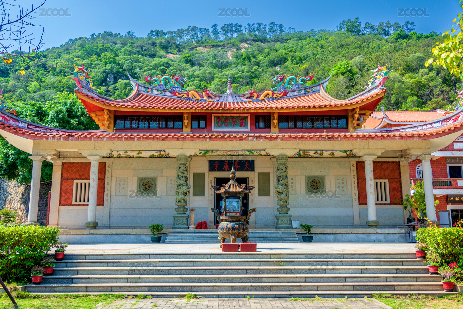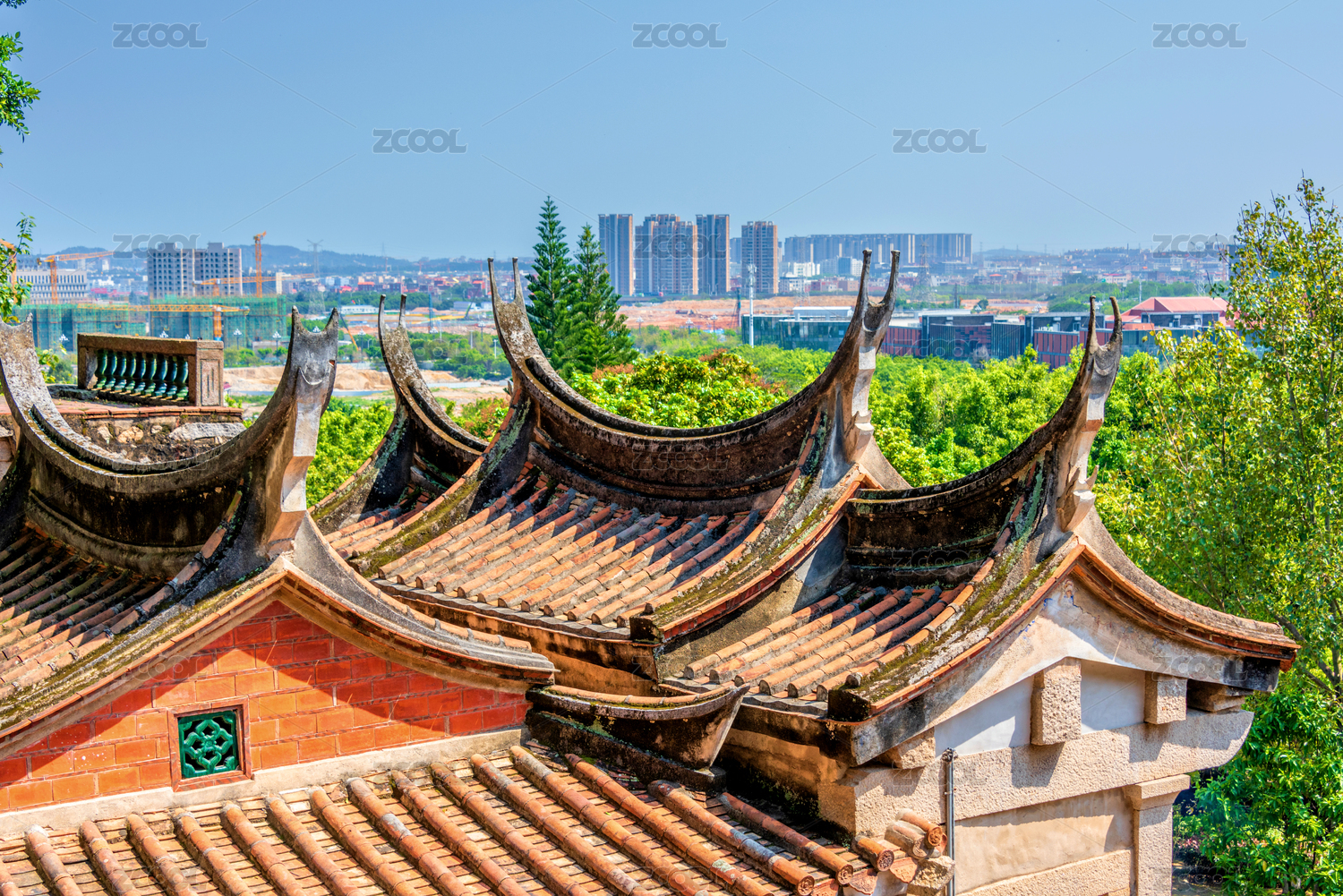 中國(guó)傳統(tǒng)古寺廟,草庵寺屋頂和泉州城市景觀