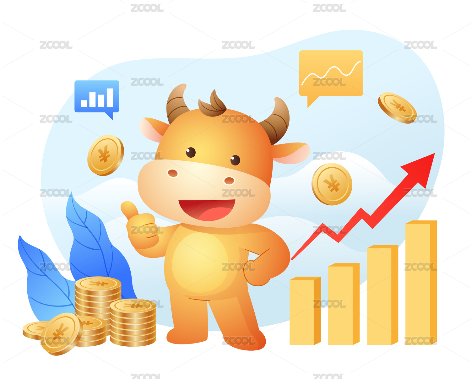 卡通牛系列之豎起大拇指和金幣箭頭等