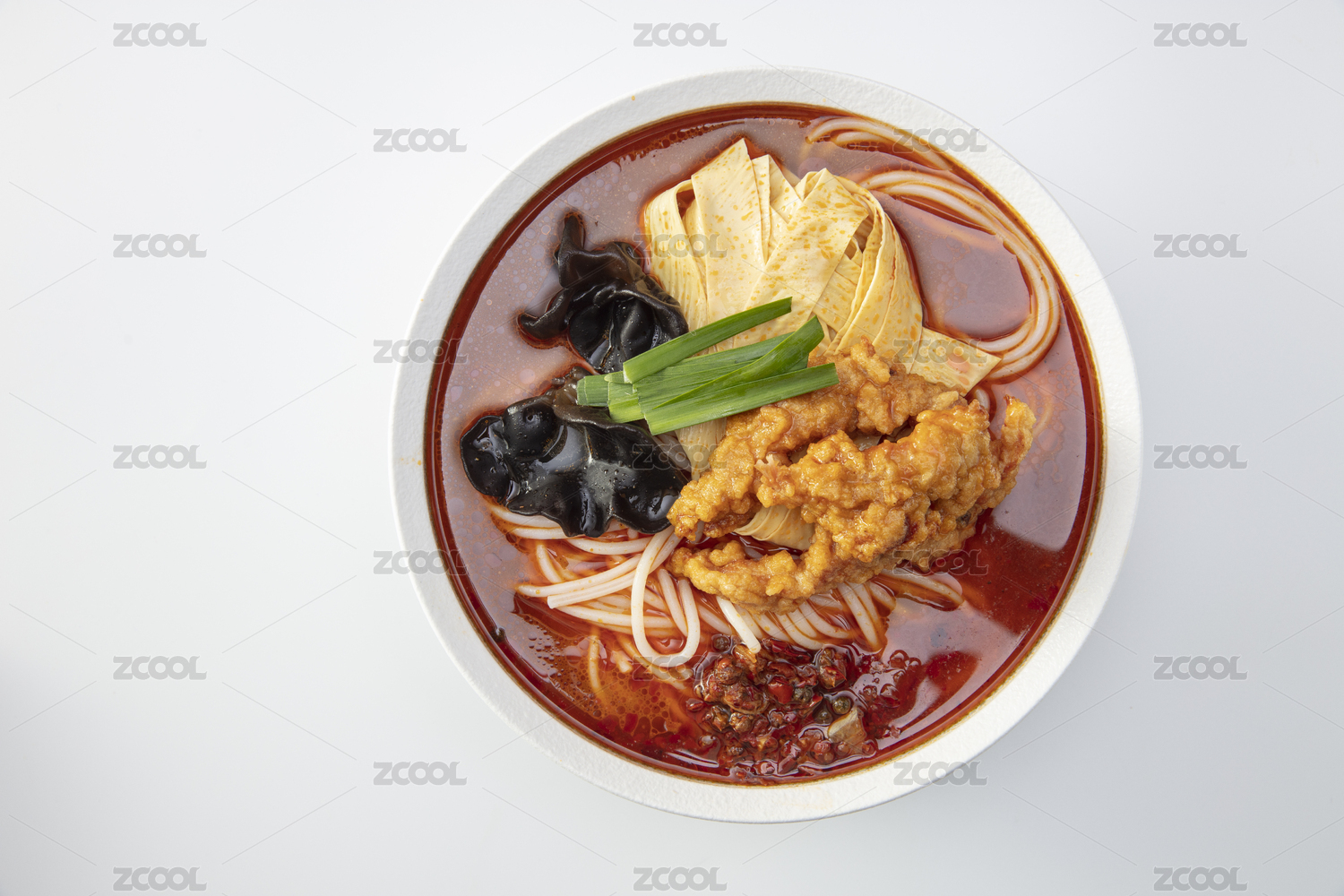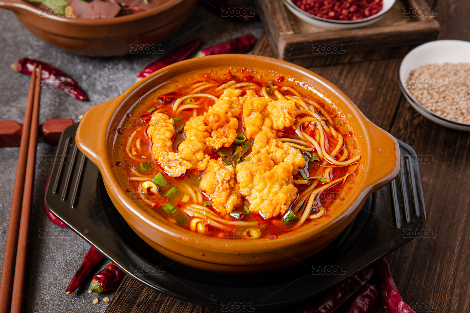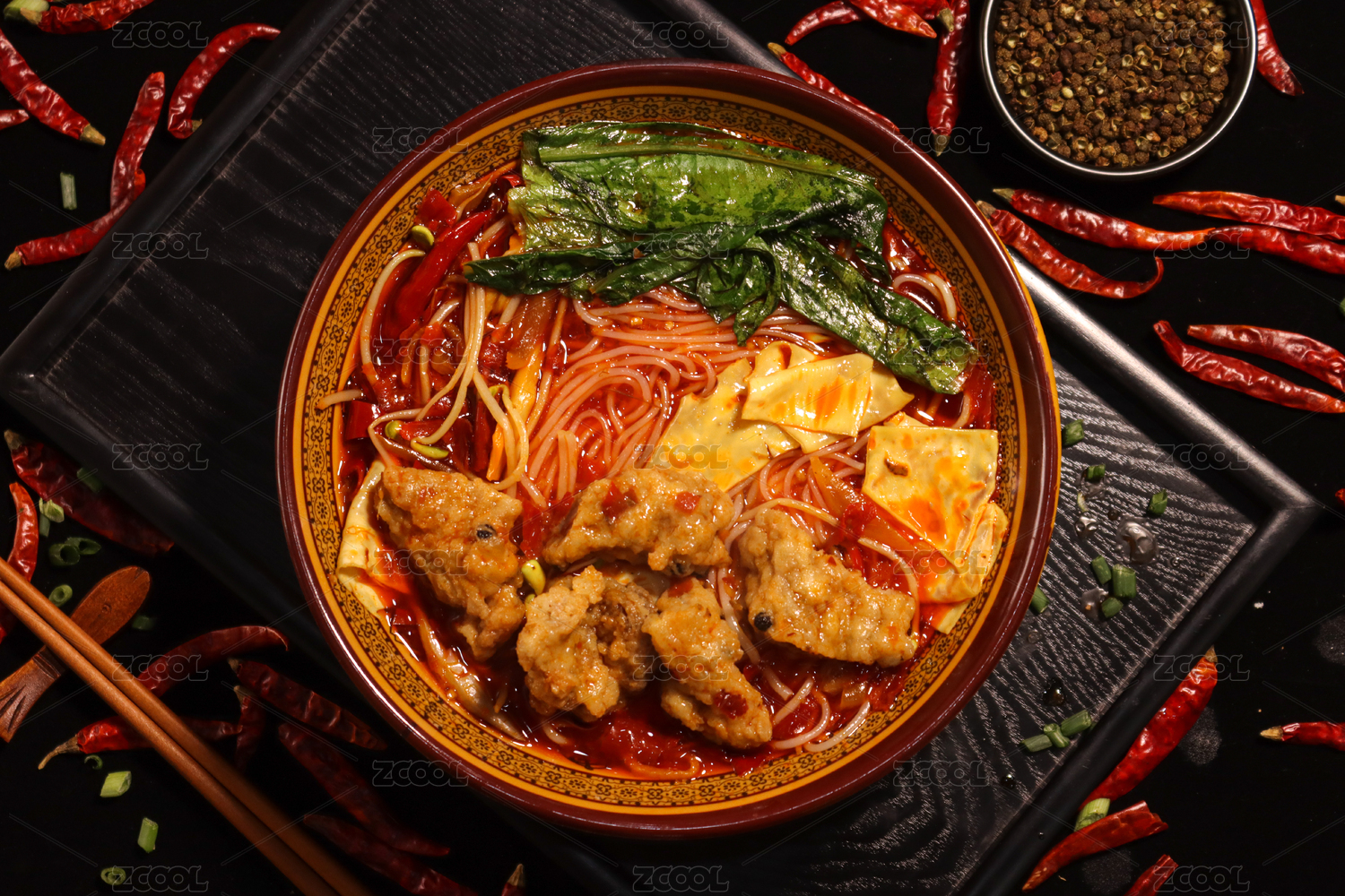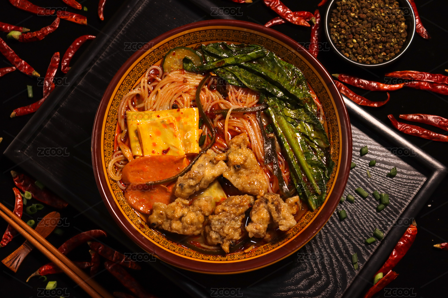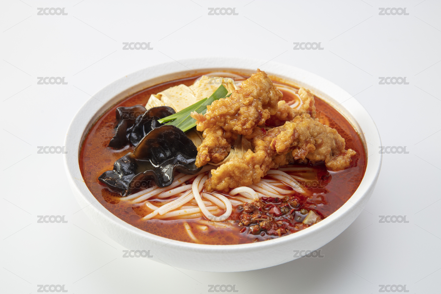 白色大碗里的香辣酥肉火鍋米線