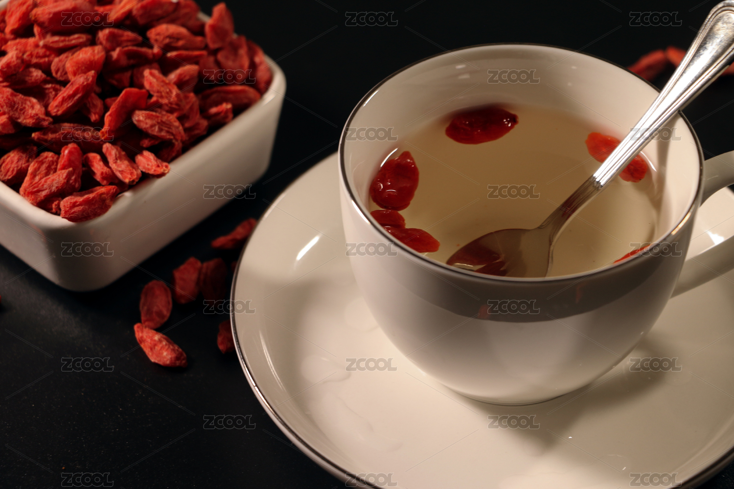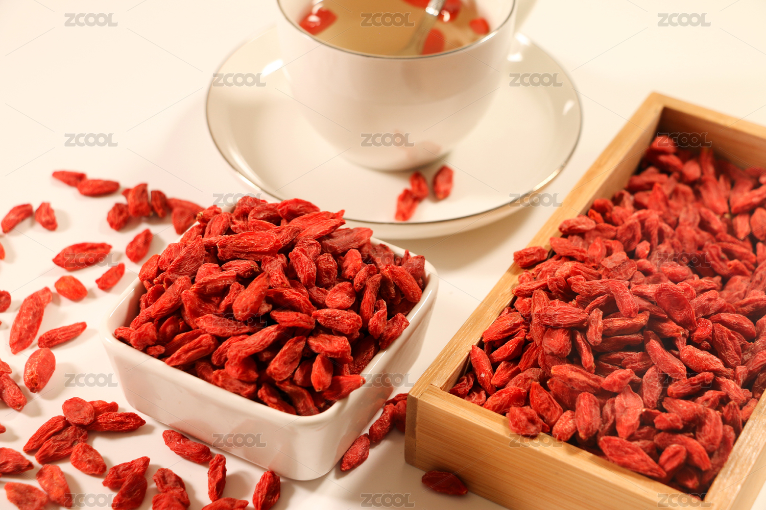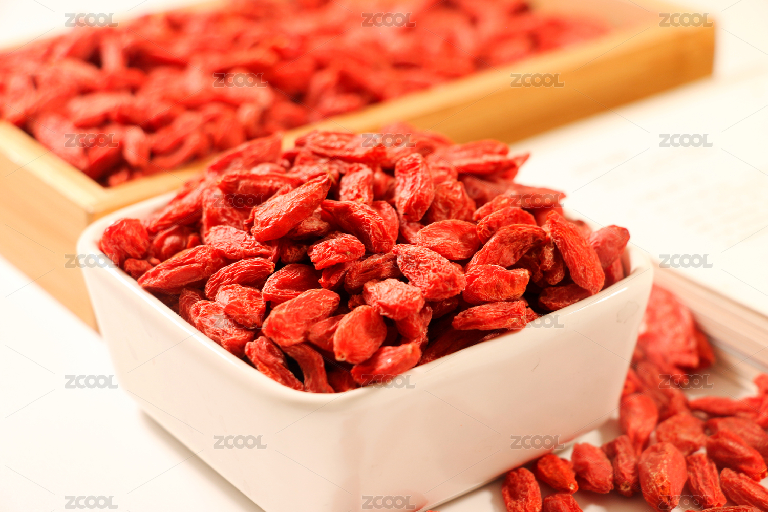 白色背景上一堆枸杞干的特寫