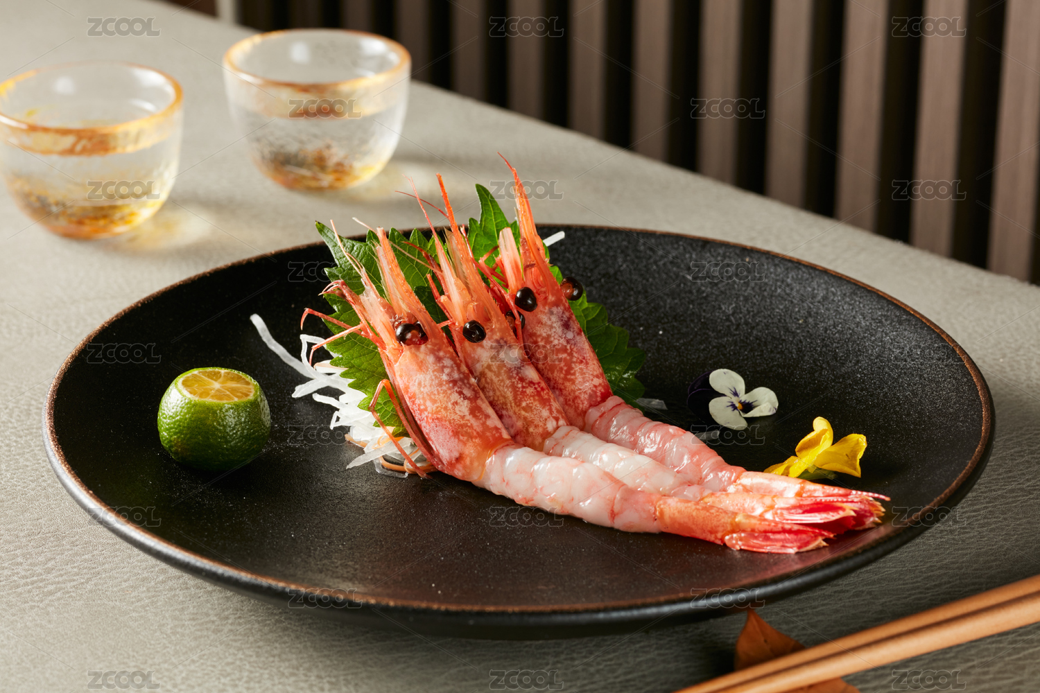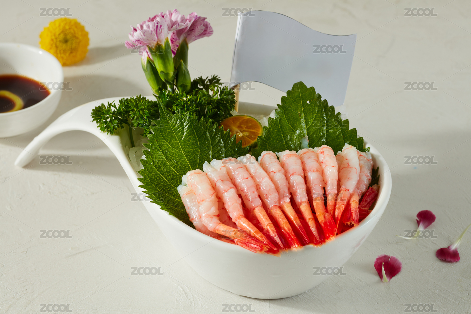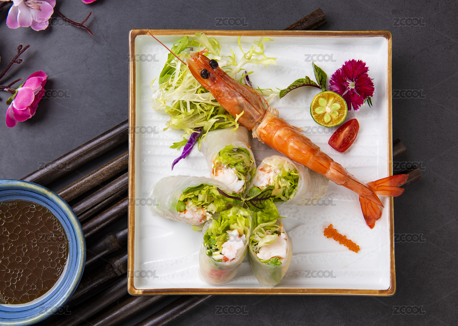 北極甜蝦刺身配蝦肉蔬菜春卷