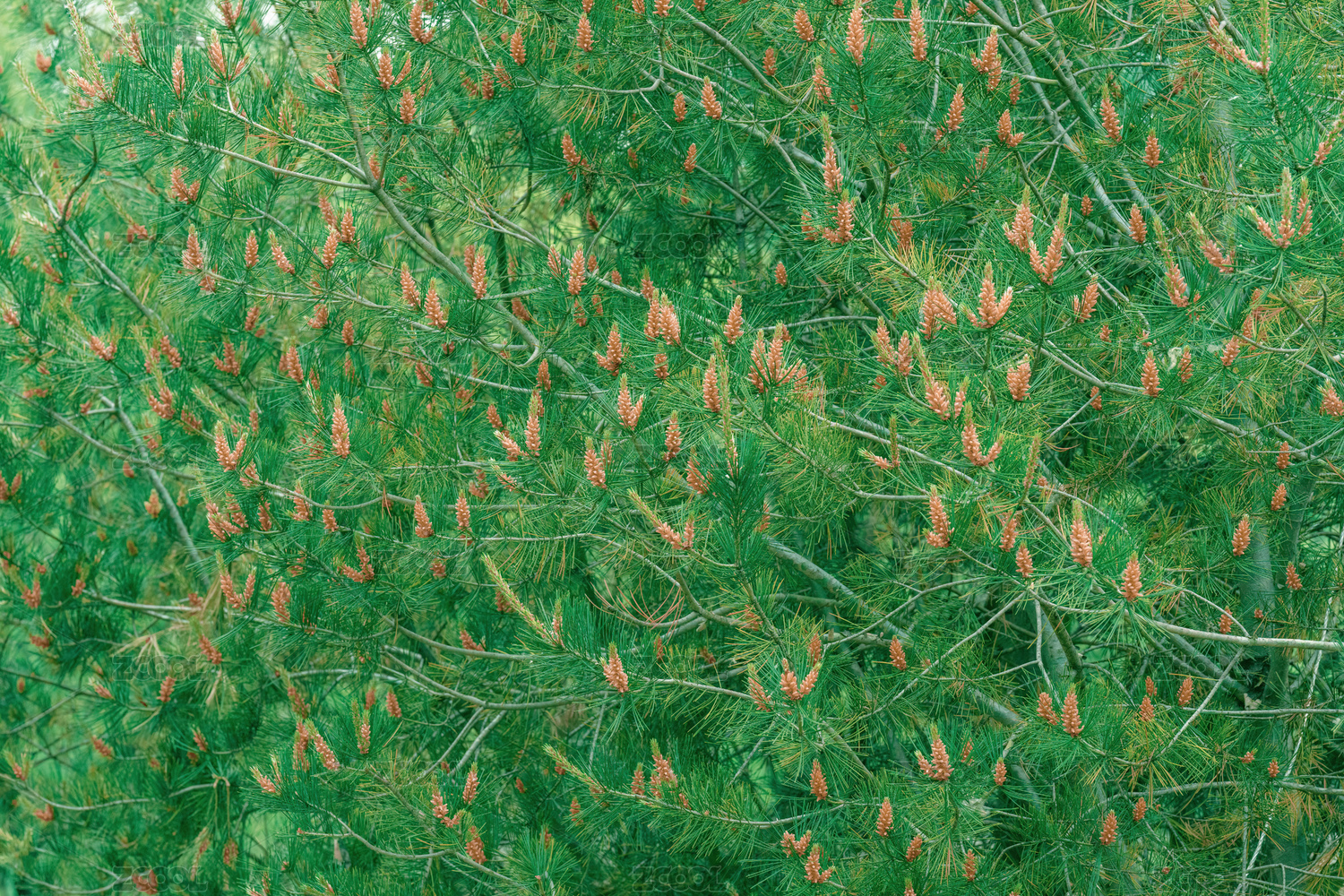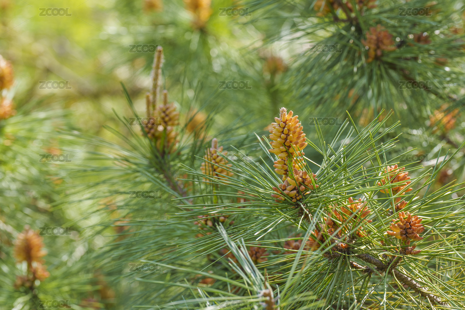 特寫綠色松針和松花