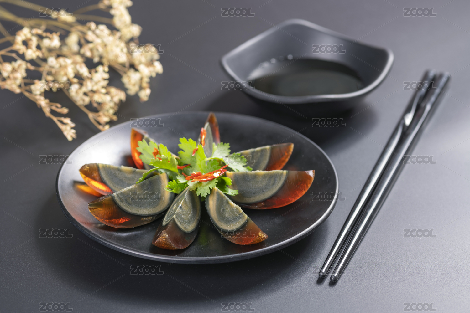 深色背景上一盤松花蛋特寫