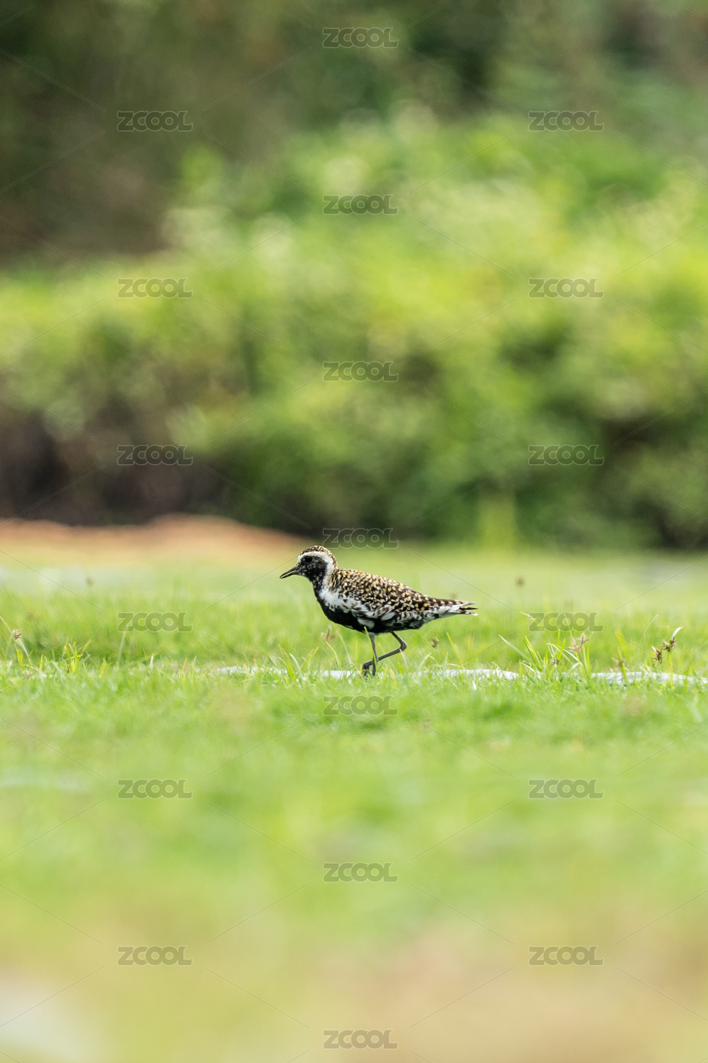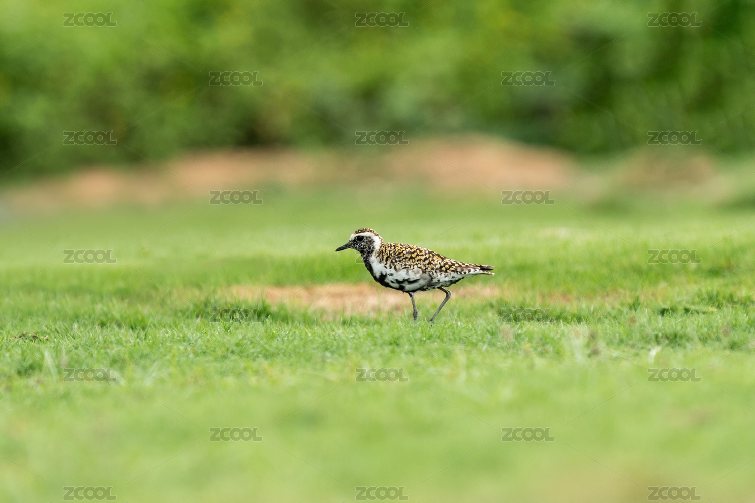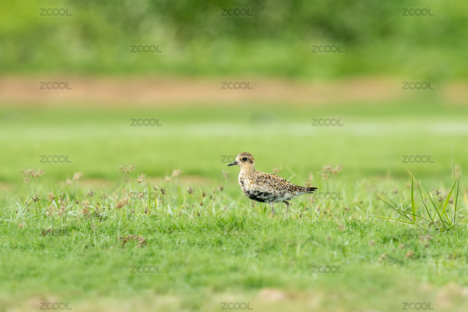 一只金斑鸻鳥于河岸空曠草地尋覓食物