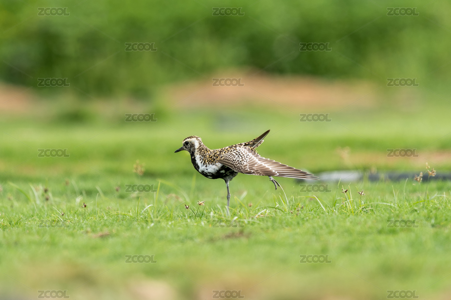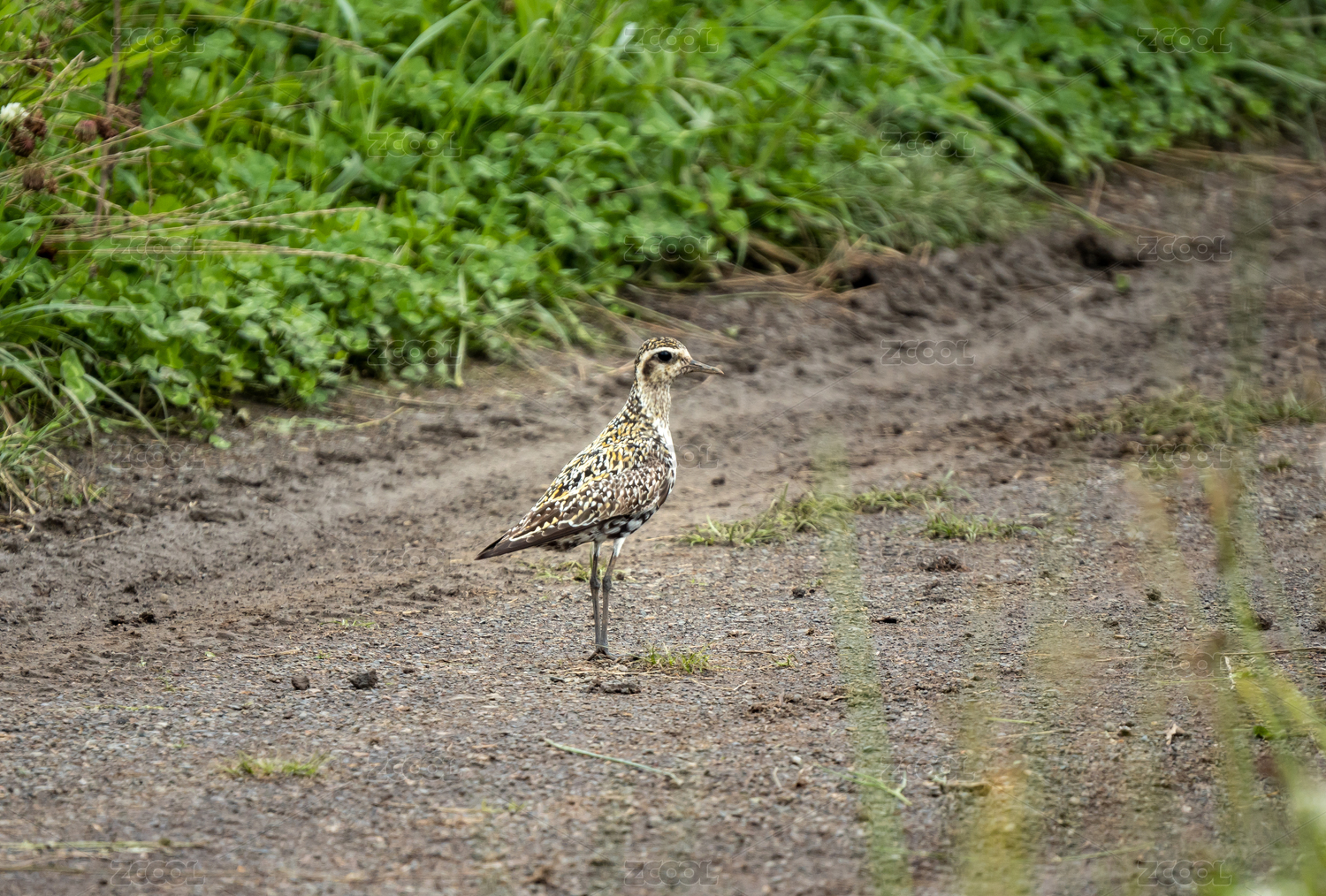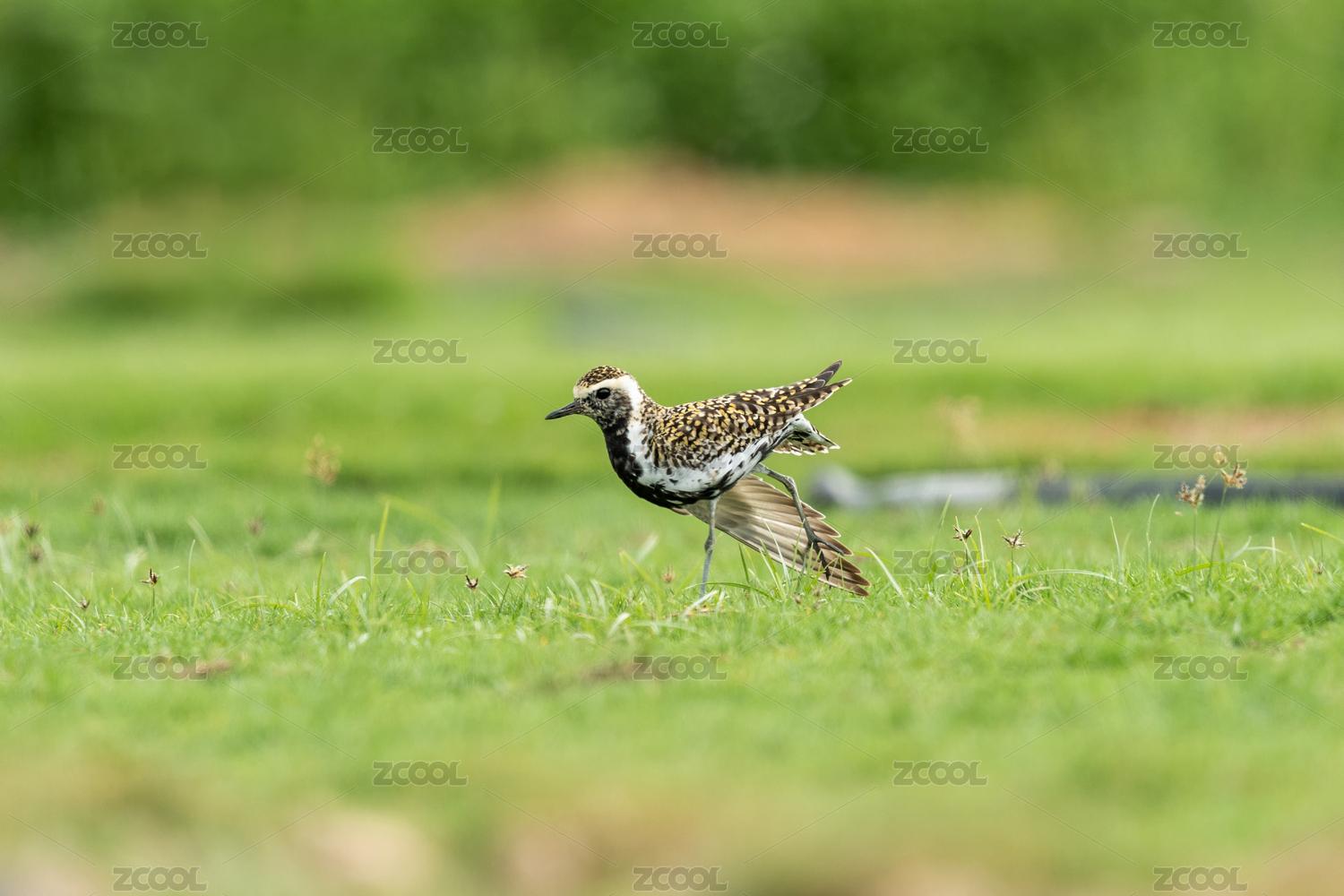 一只金斑鸻鳥于河岸空曠草地尋覓食物