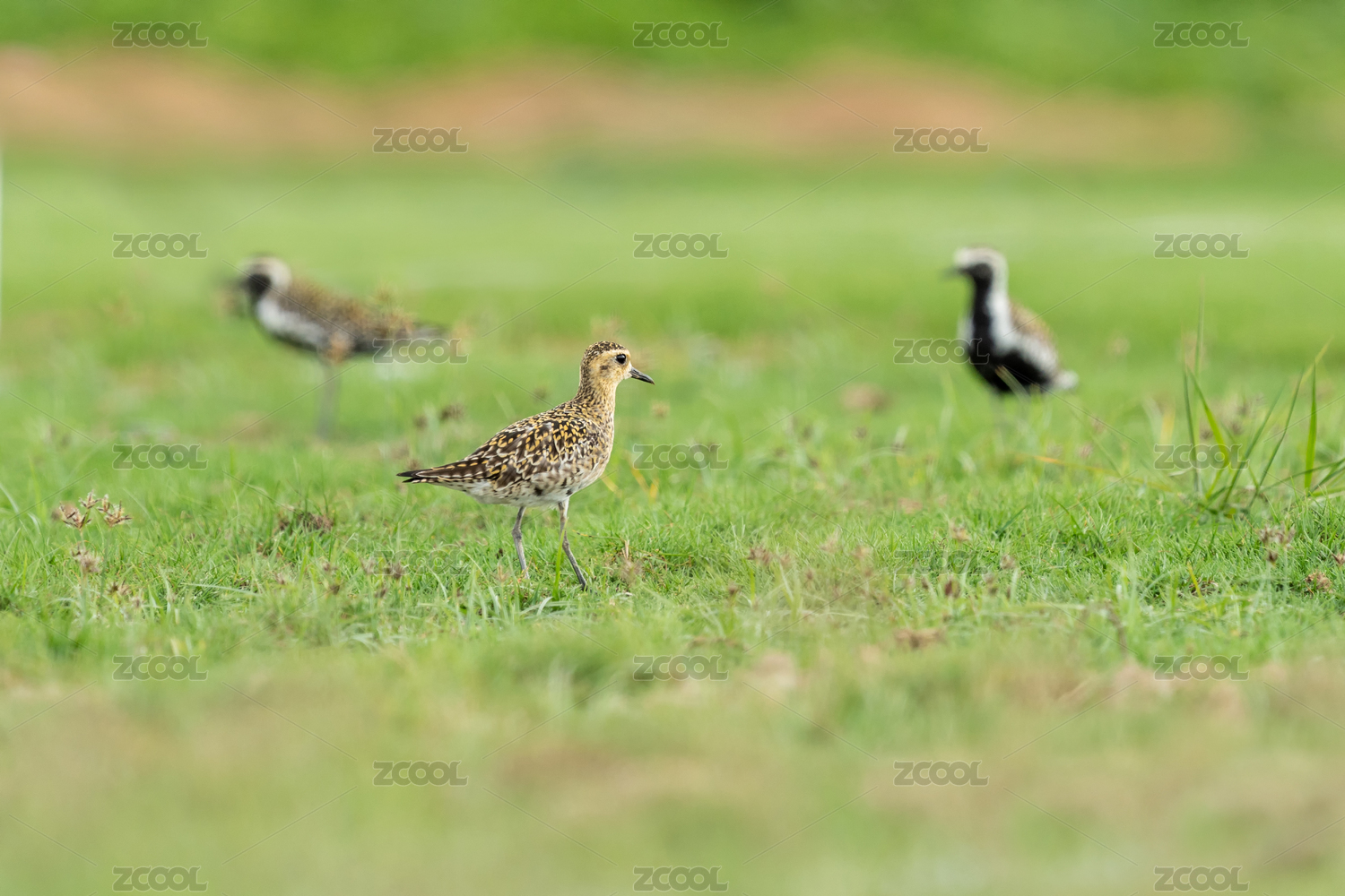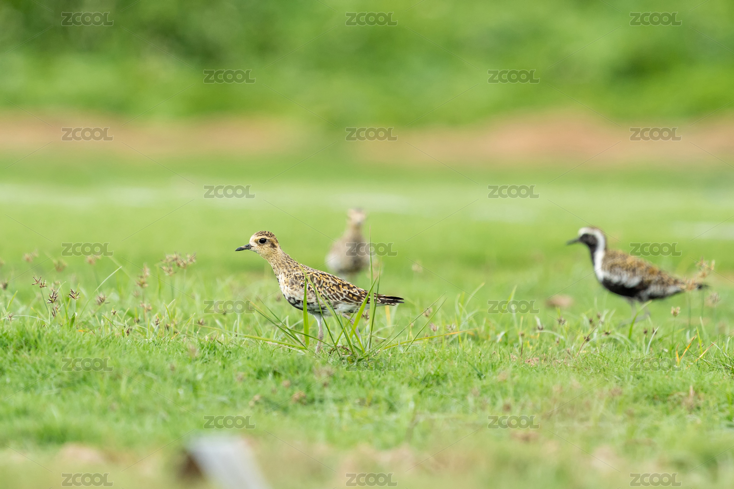 一群金斑鸻鳥于河岸空曠草地游走覓食