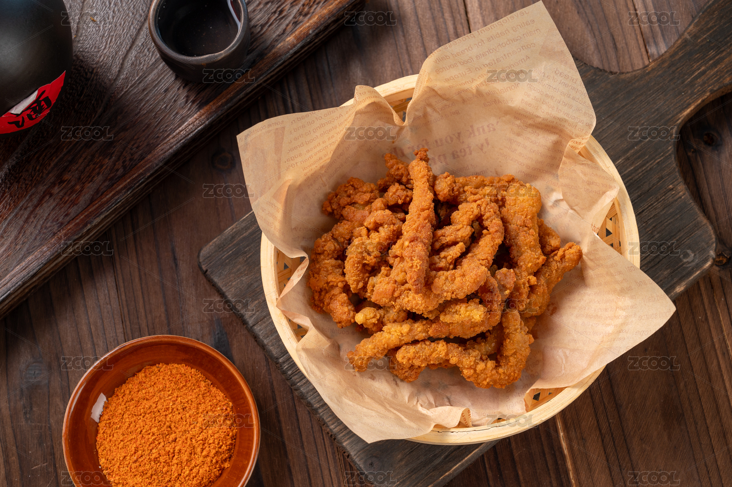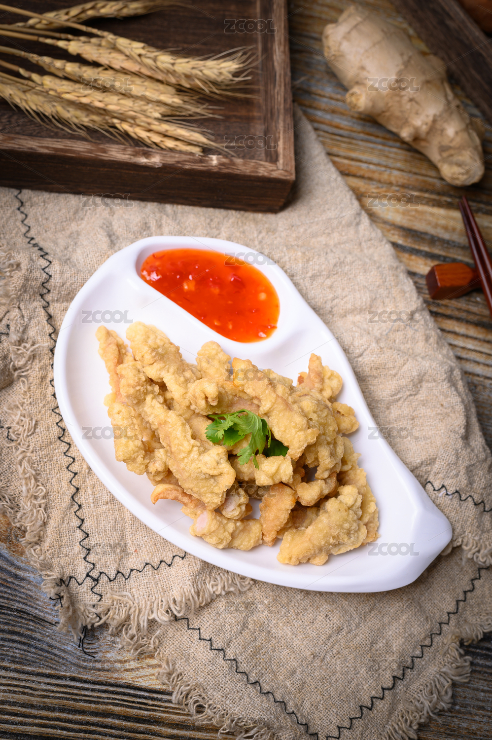 白盤里的現(xiàn)炸小酥肉配辣椒面