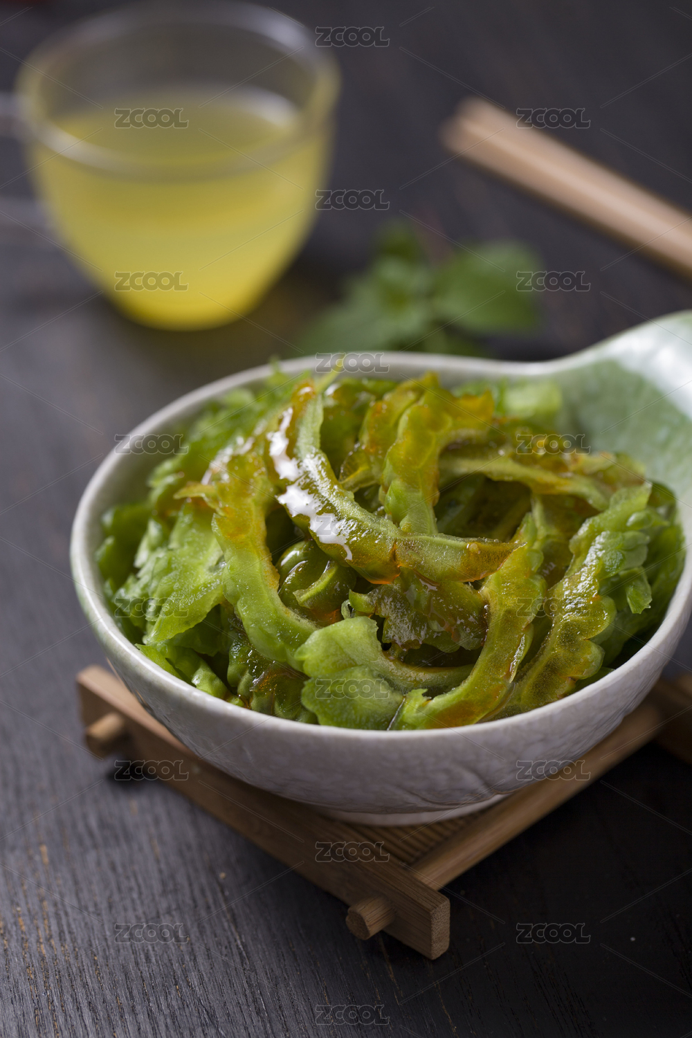 放在深色餐布上的一碗中國傳統(tǒng)家常涼拌菜— 涼拌苦瓜絲