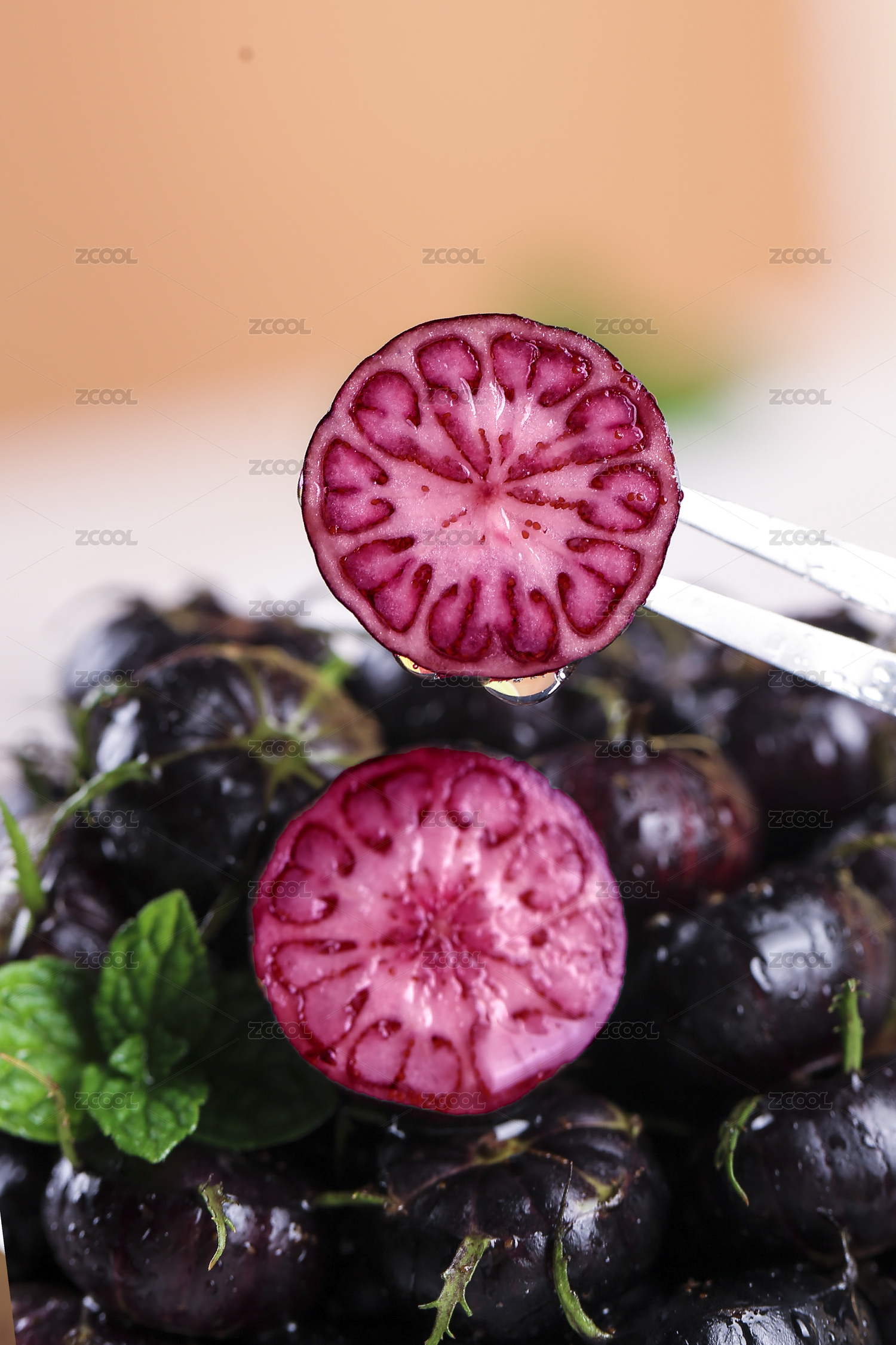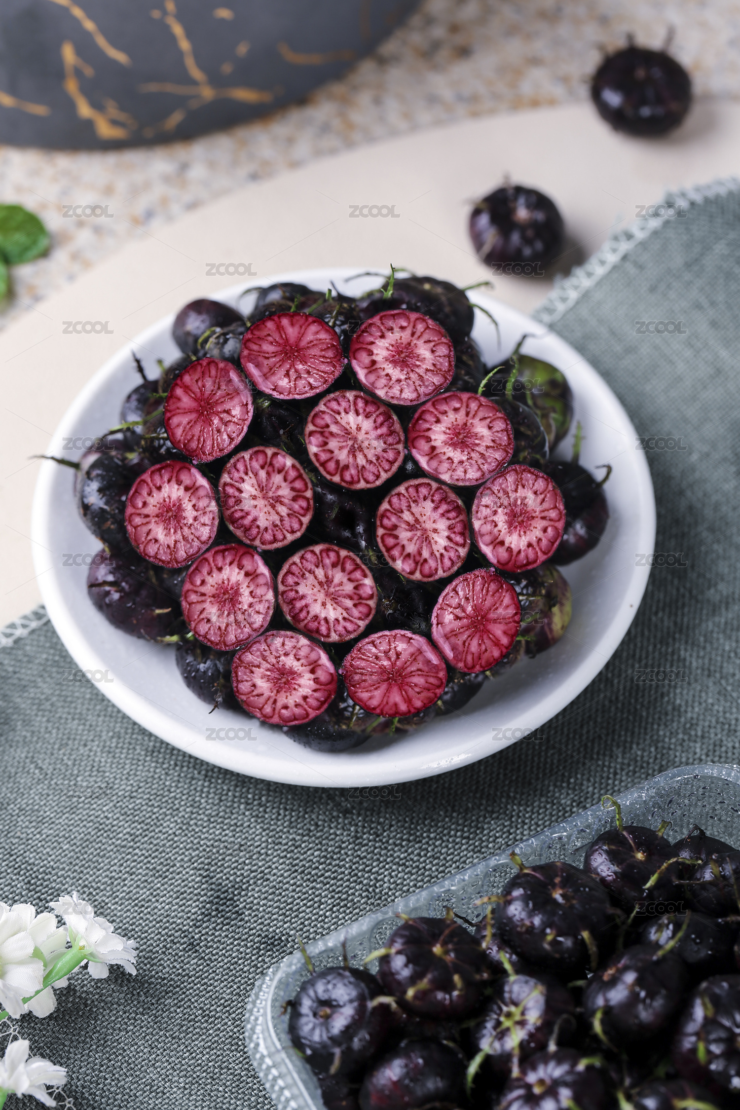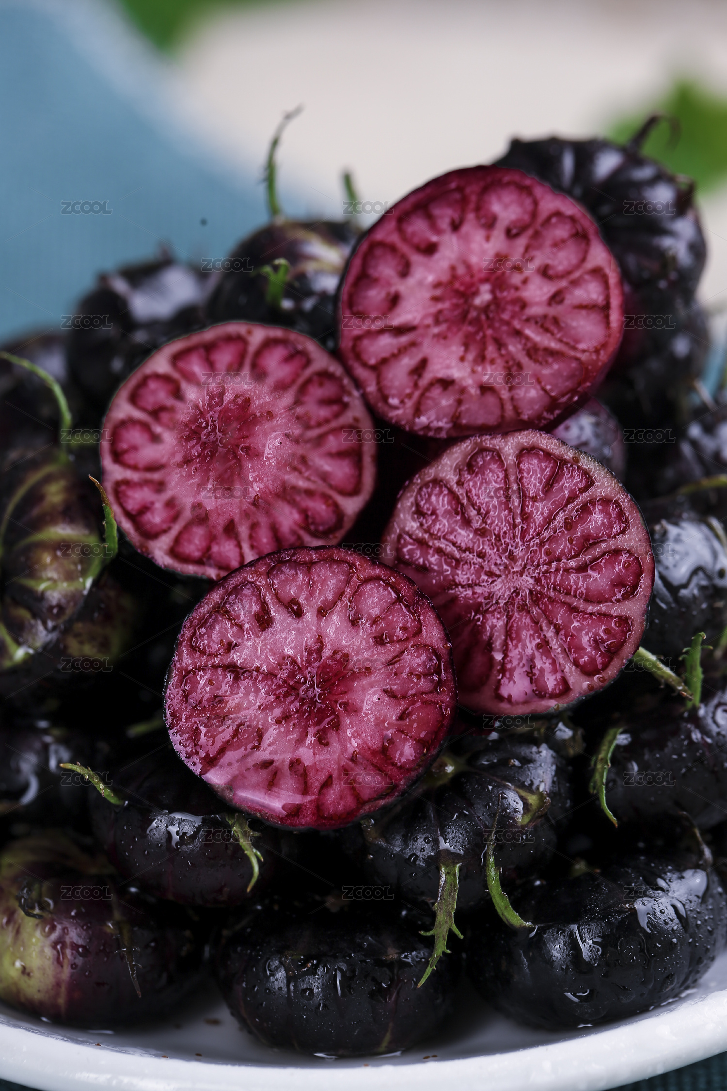 白底上放著半邊切面的紅果參