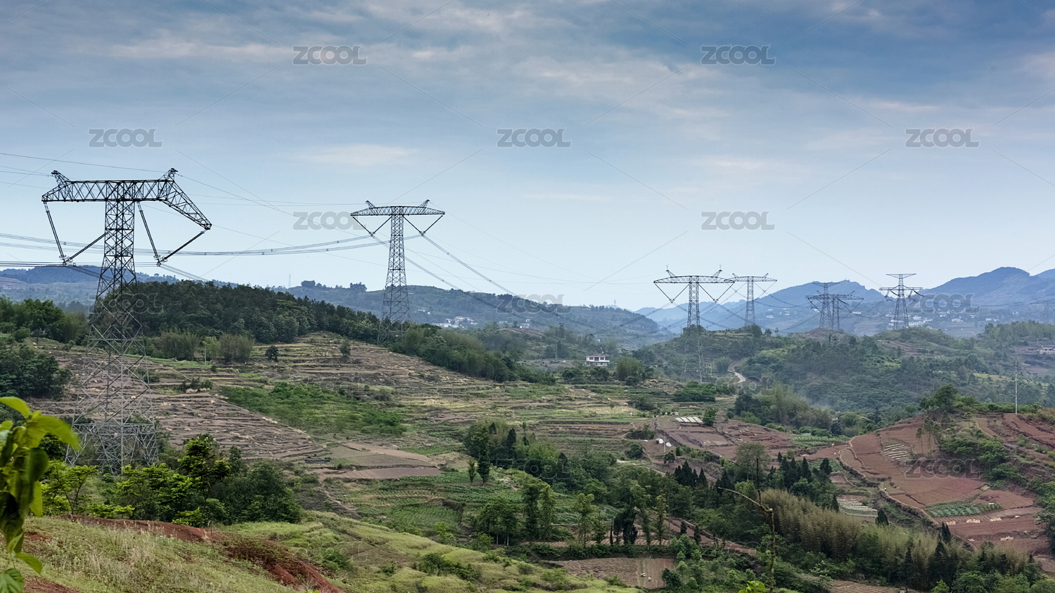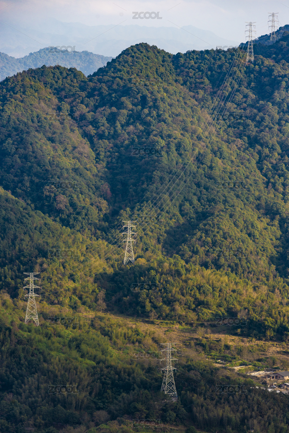 茂盛的森林覆蓋下的山峰間幾個(gè)高壓輸電線塔架穿行其間
