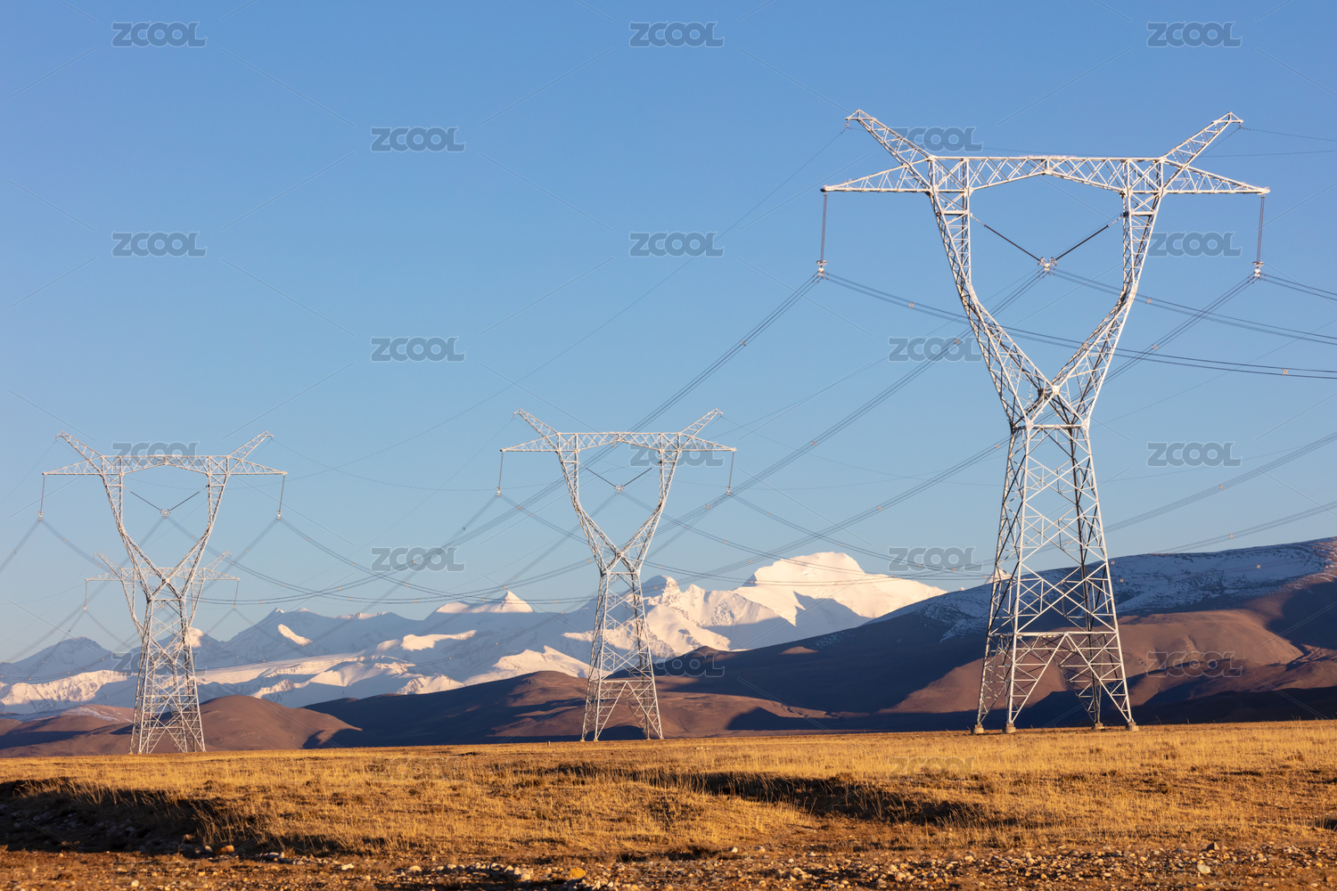 中國西藏拉布吉康山脈前的高壓輸電線塔