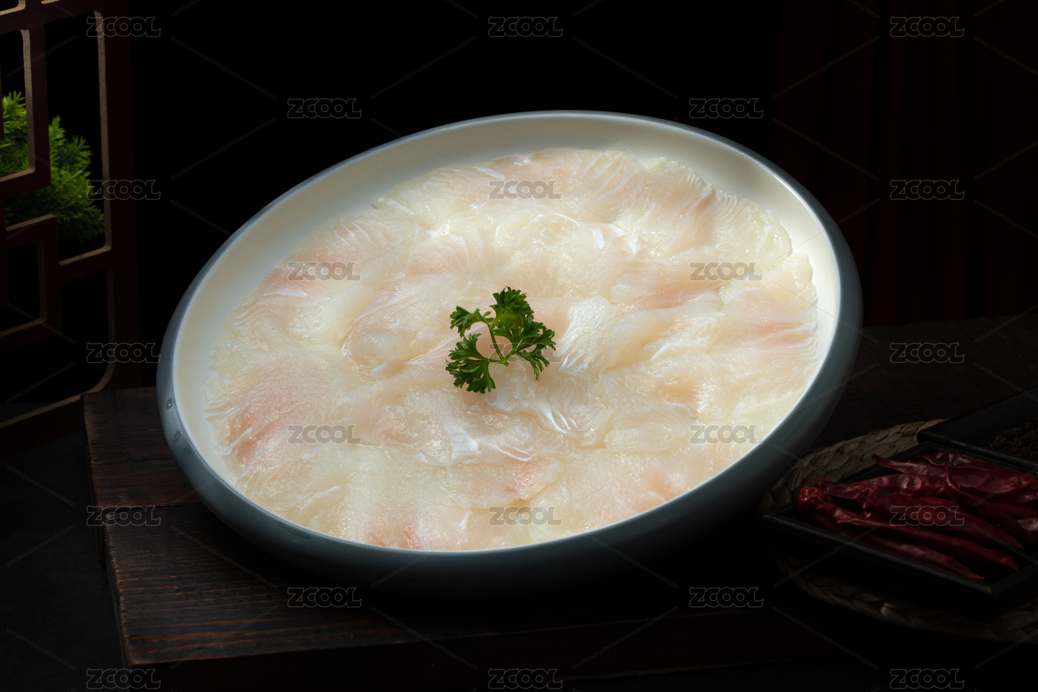 桌子白盤里的四川重慶火鍋菜品生魚肉片