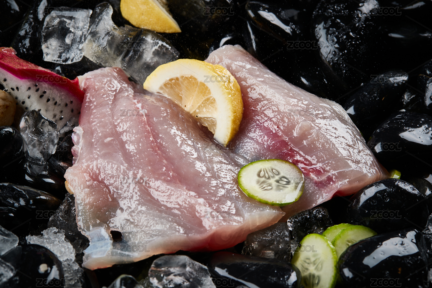 黑色鵝卵石上擺放的新鮮野生魚肉
