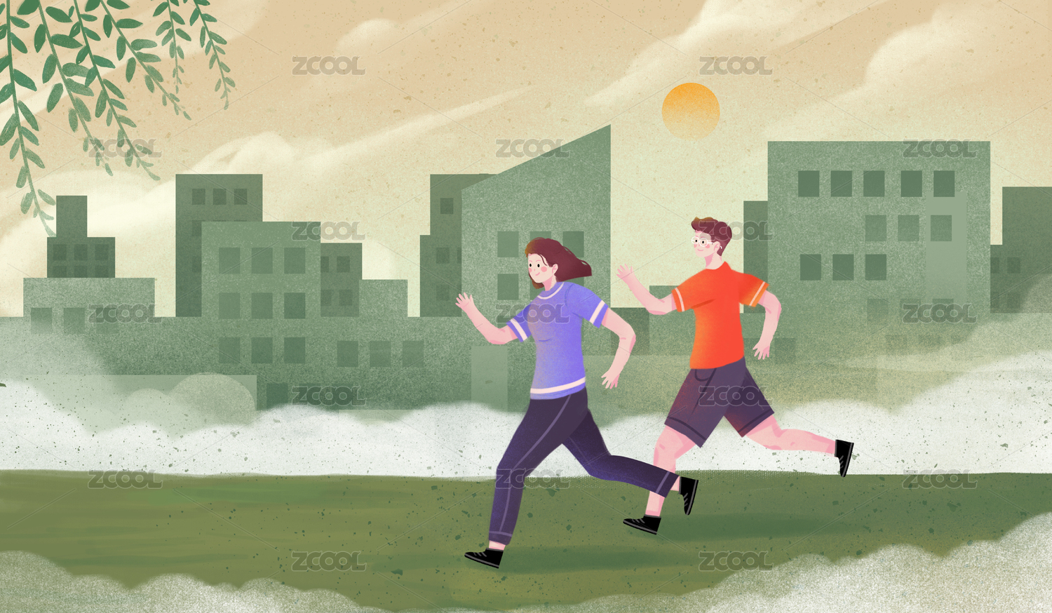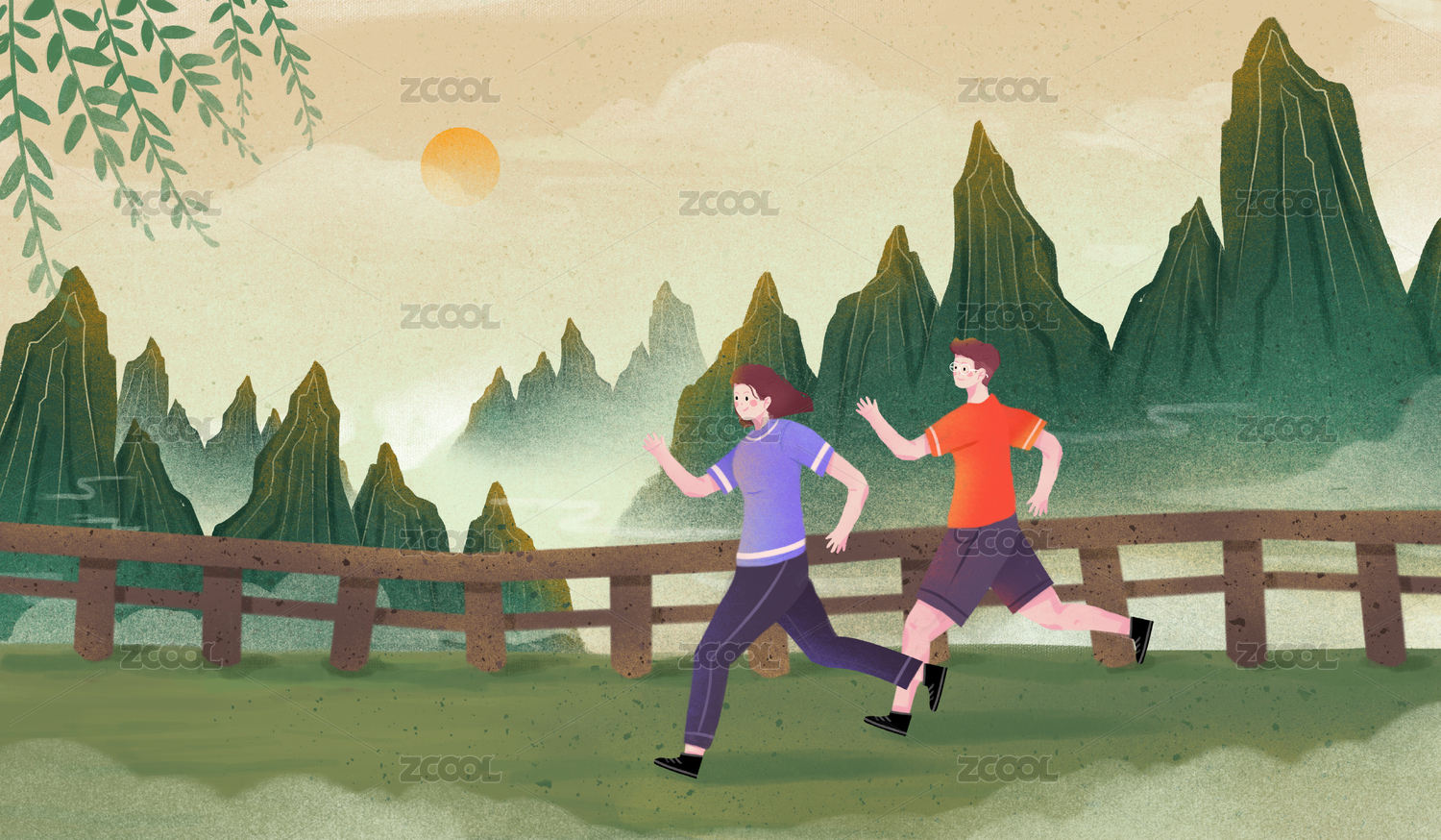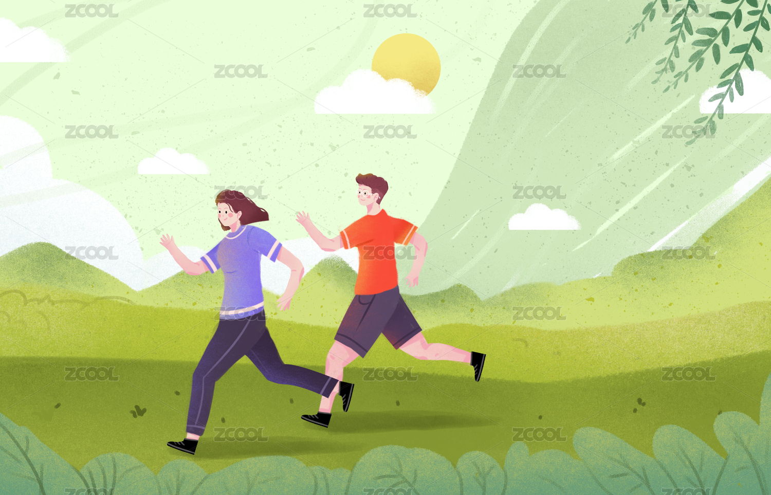 全民健身日正在草原中進行熱身跑步的兩個人