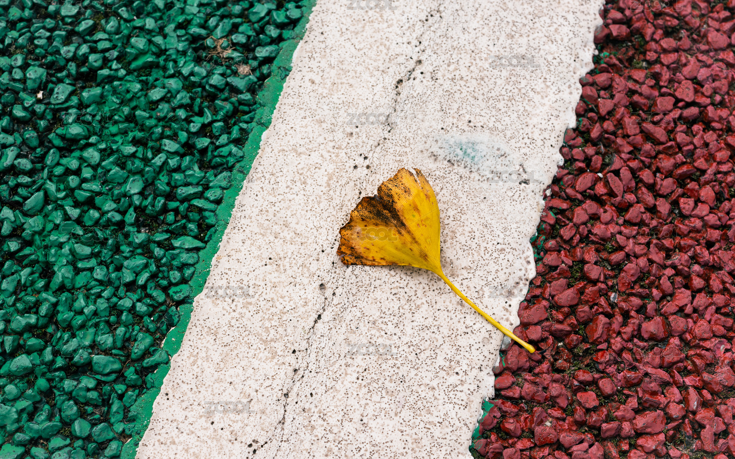 一片枯萎的銀杏樹葉躺在塑膠地面上