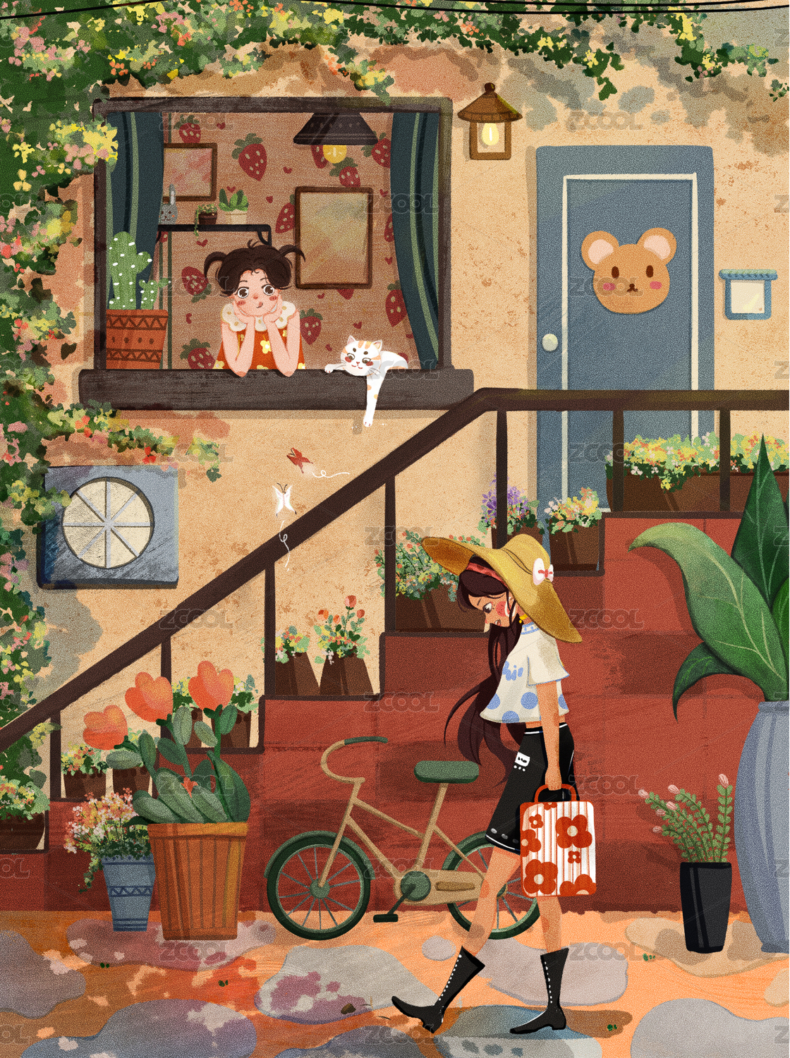 下午女孩在窗臺(tái)發(fā)呆看見有美女經(jīng)過,復(fù)古插
