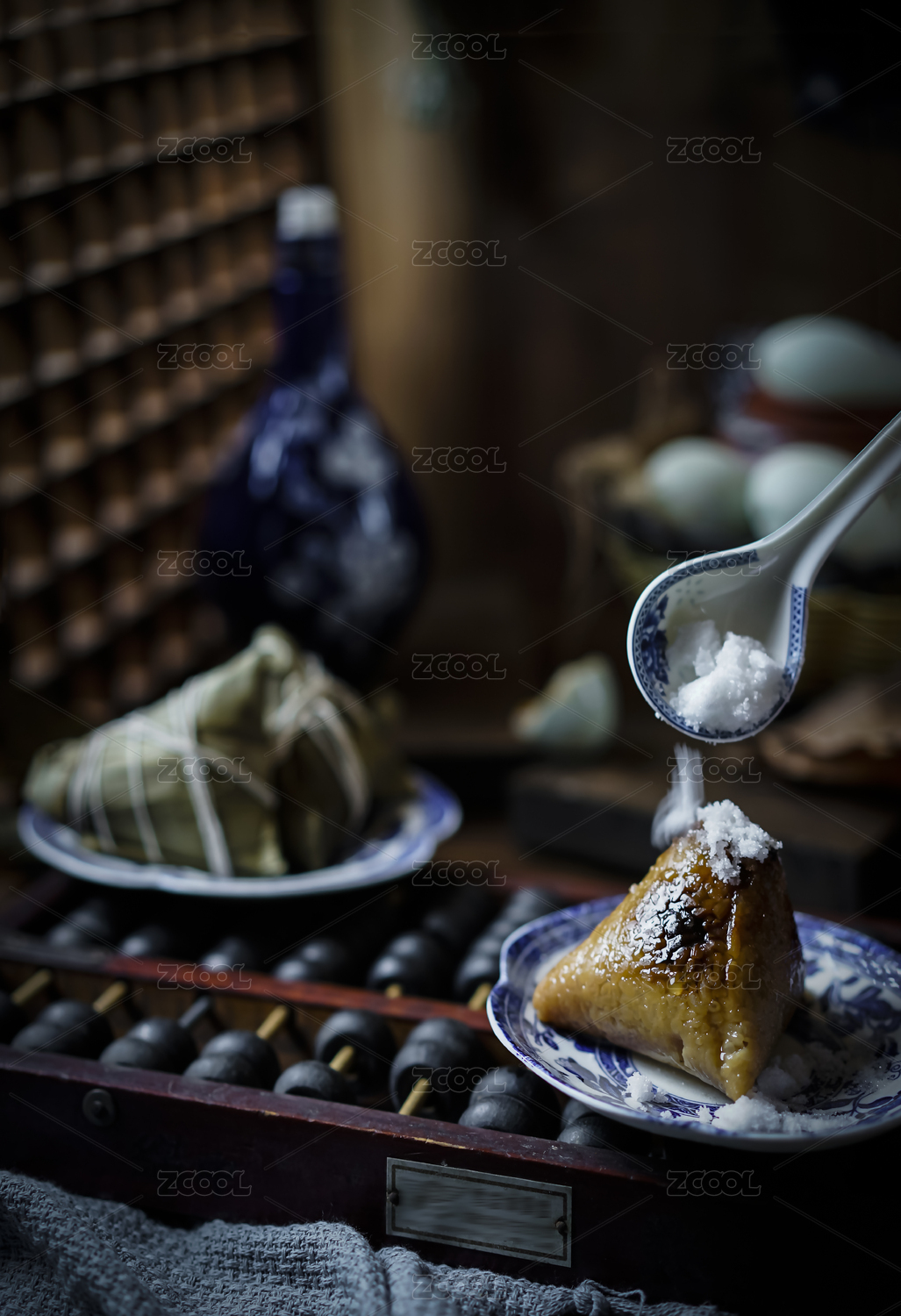端午節(jié)木窗前粽子放在算盤上