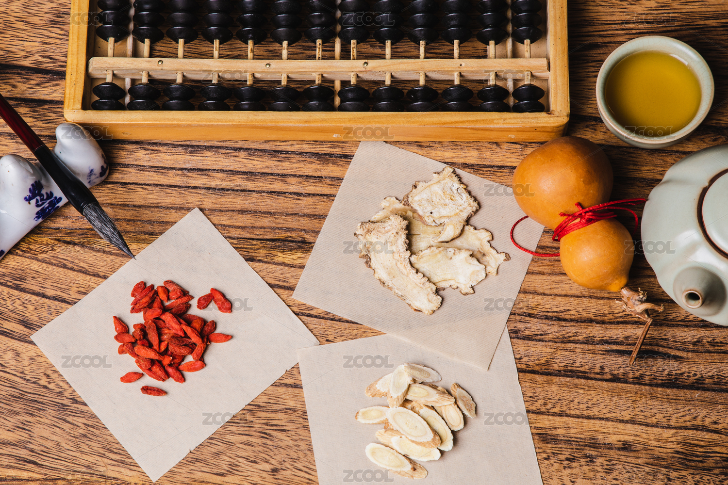 正上方視角特寫木桌上放著算盤中草藥等物件