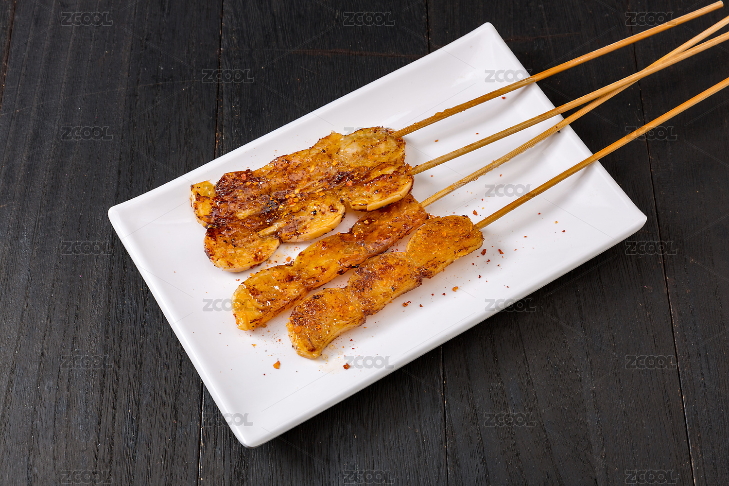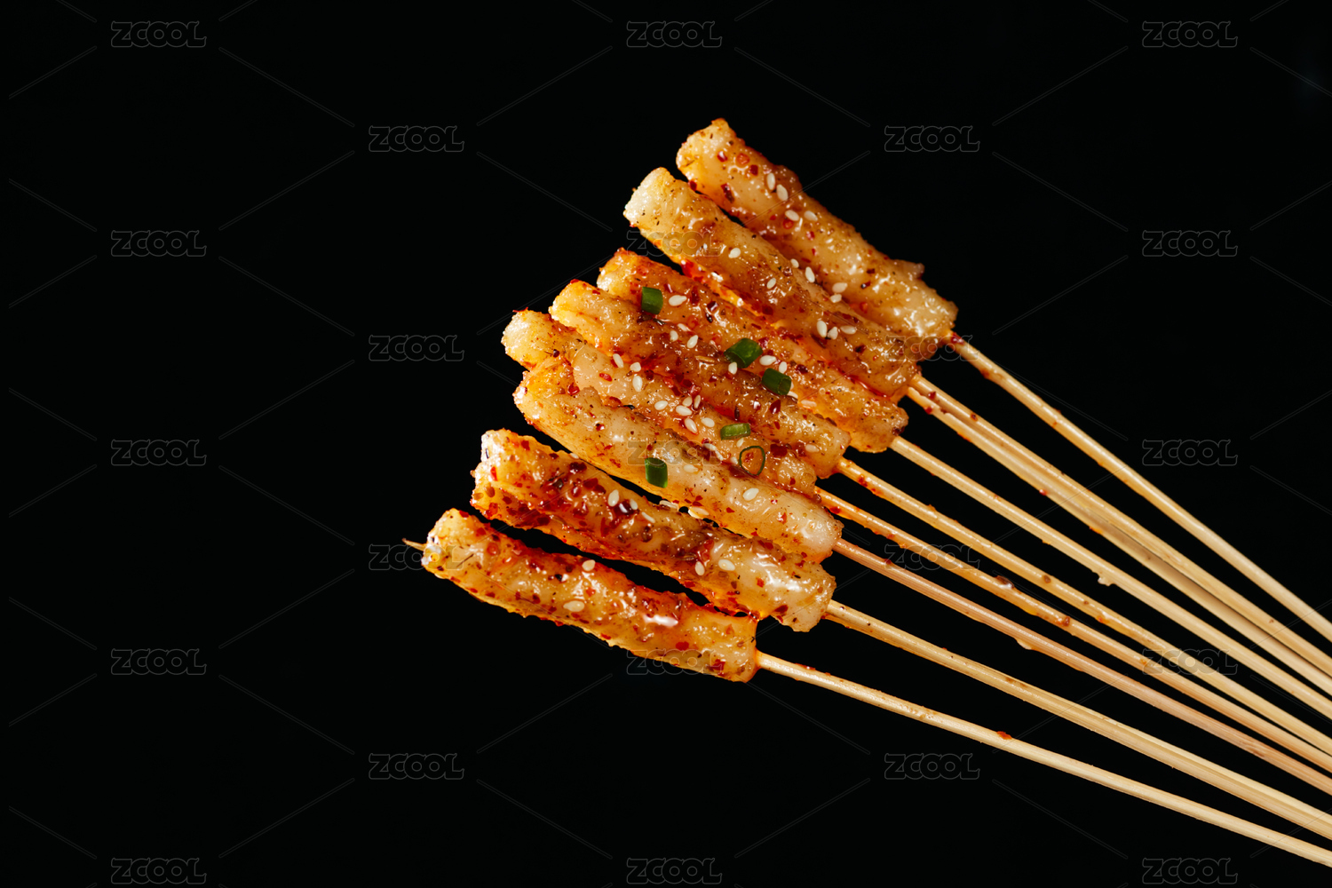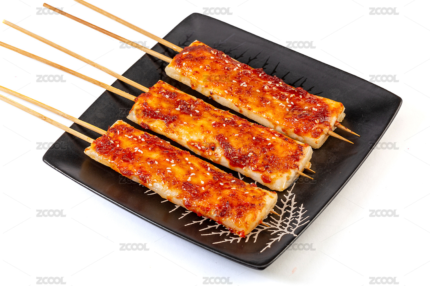 灑辣椒面的燒烤竹簽串著的麻辣烤串烤年糕