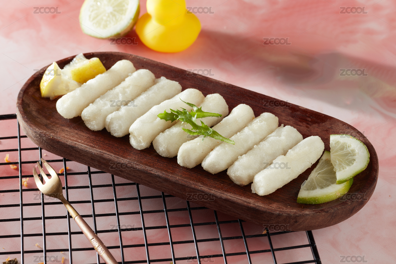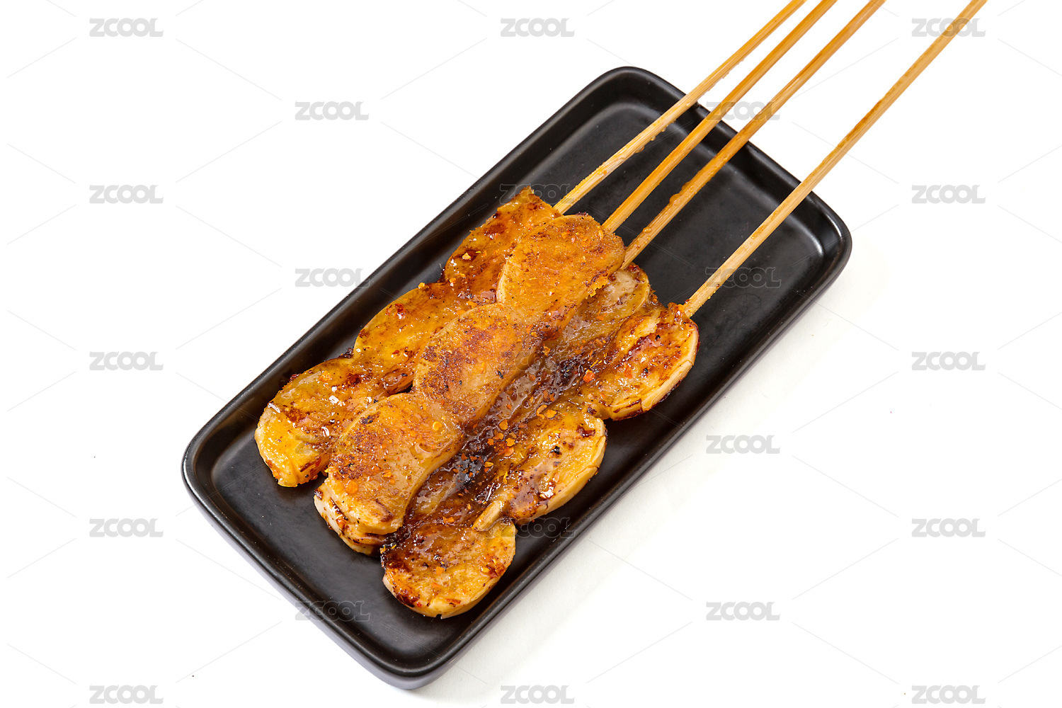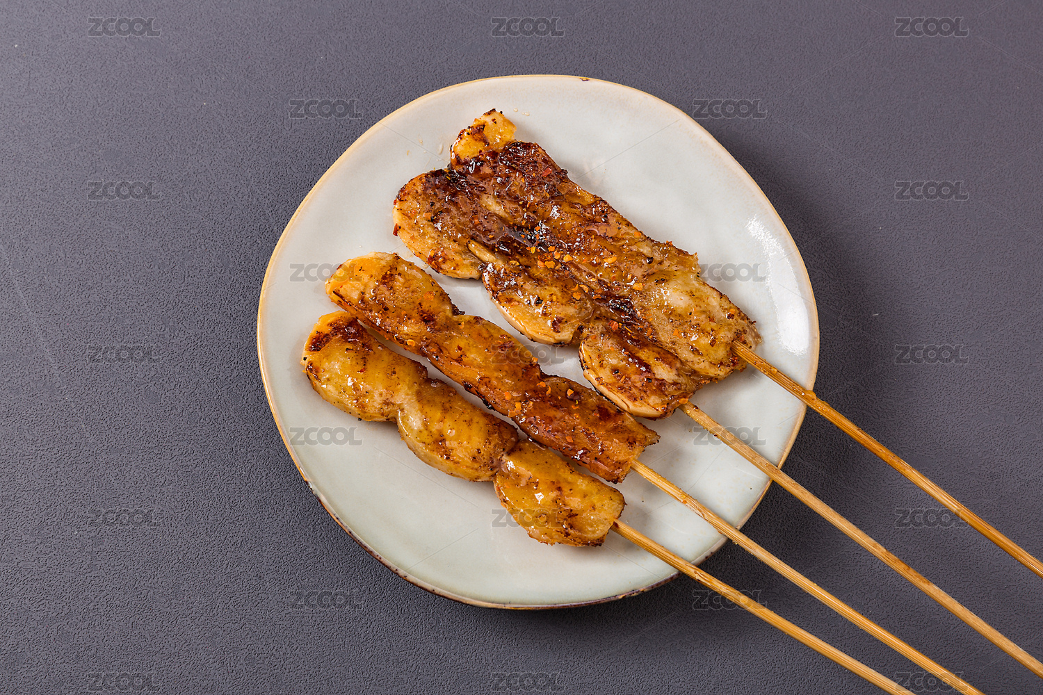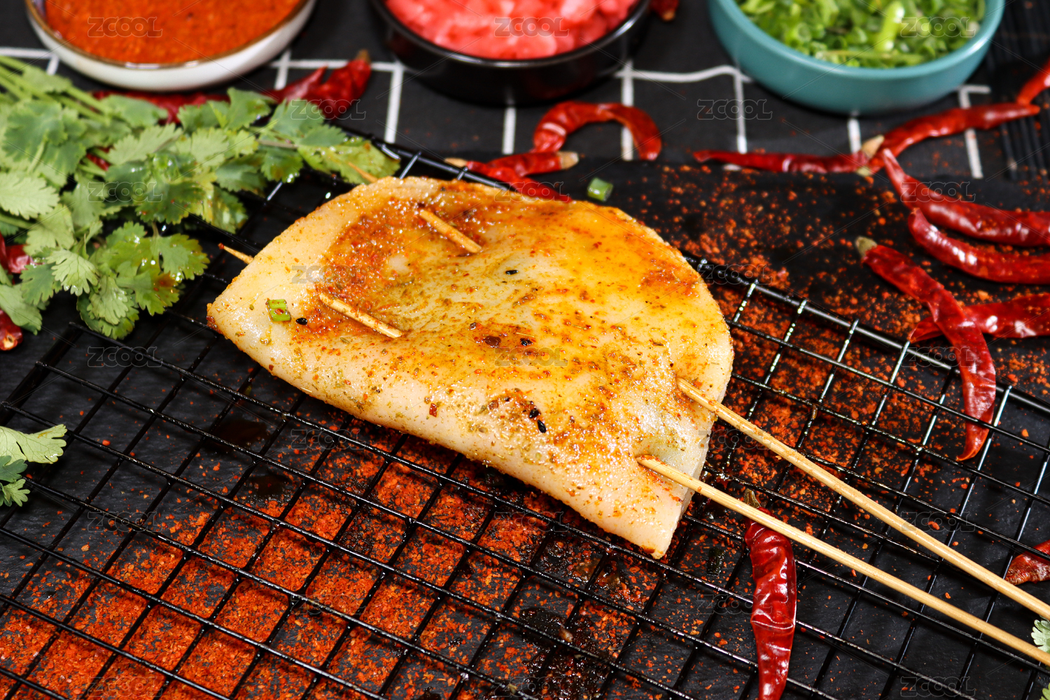 灑辣椒面的燒烤竹簽串著的麻辣烤串烤年糕