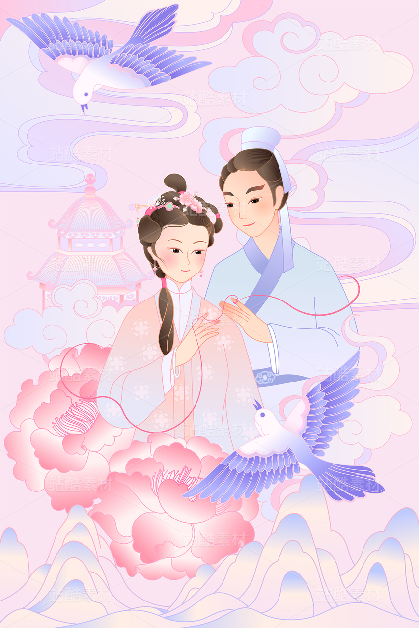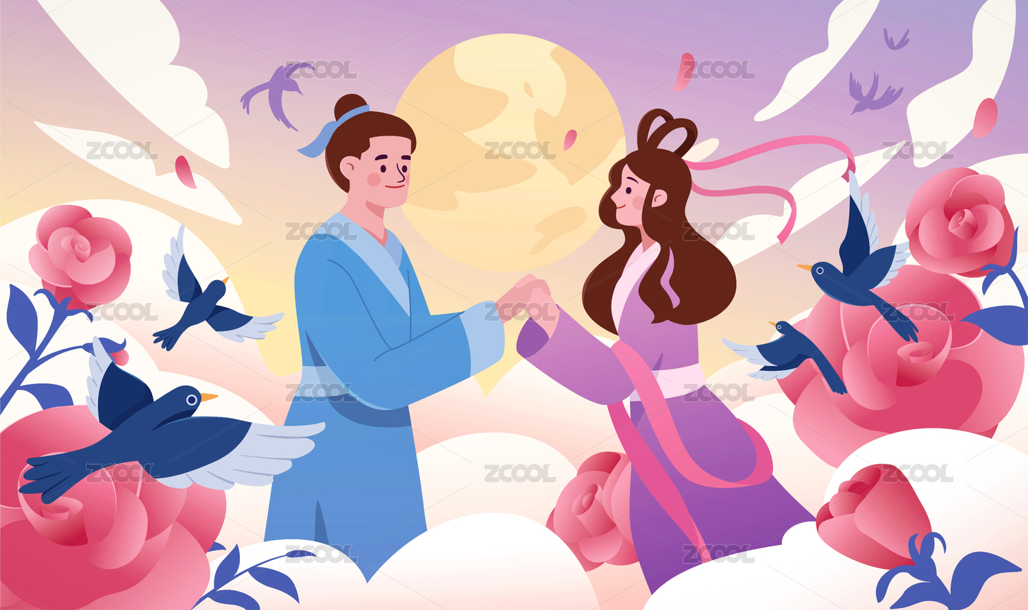 中國七夕節(jié)牛郎織女喜鵲漢服情侶花朵祥云國潮插畫