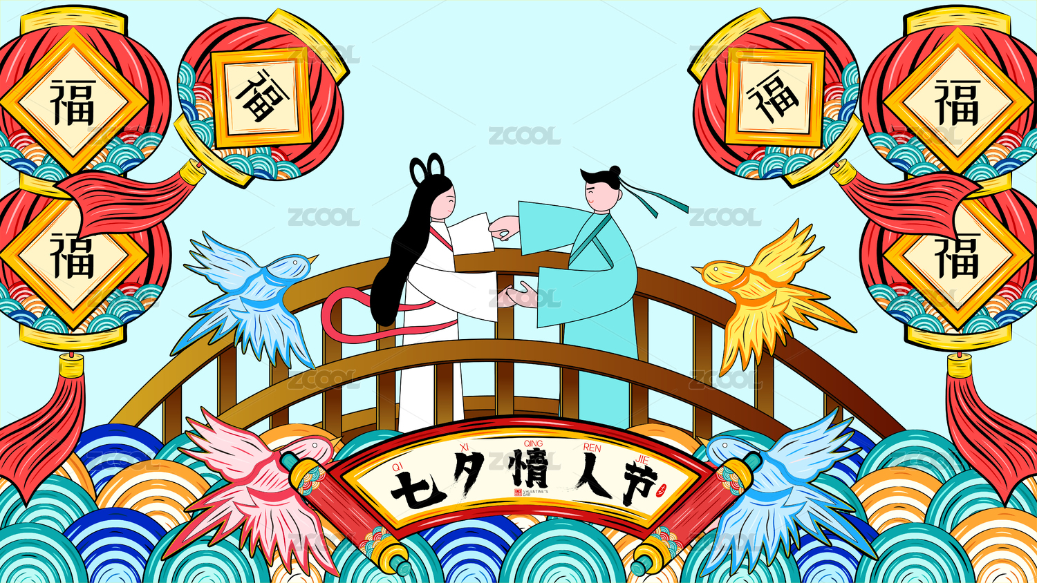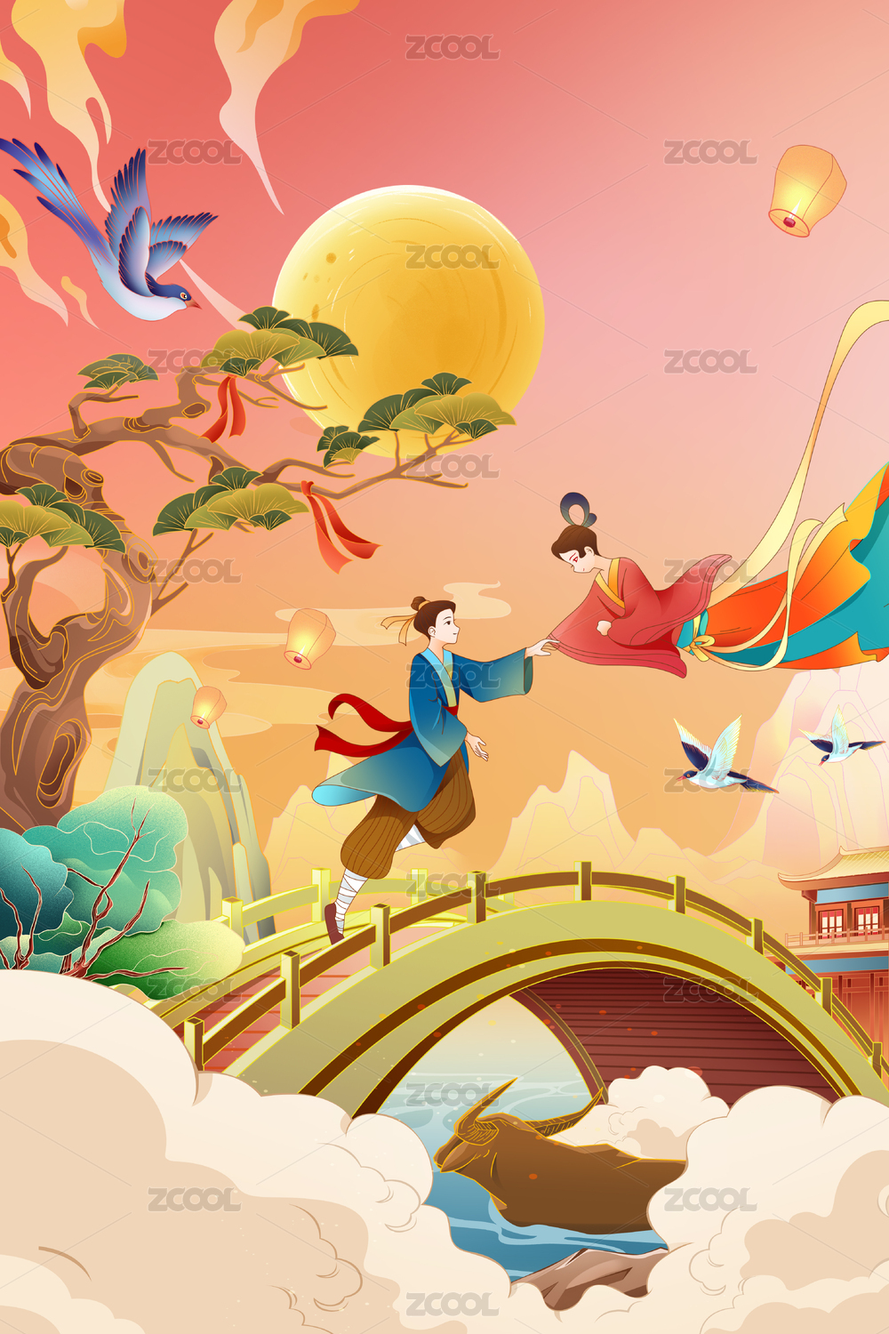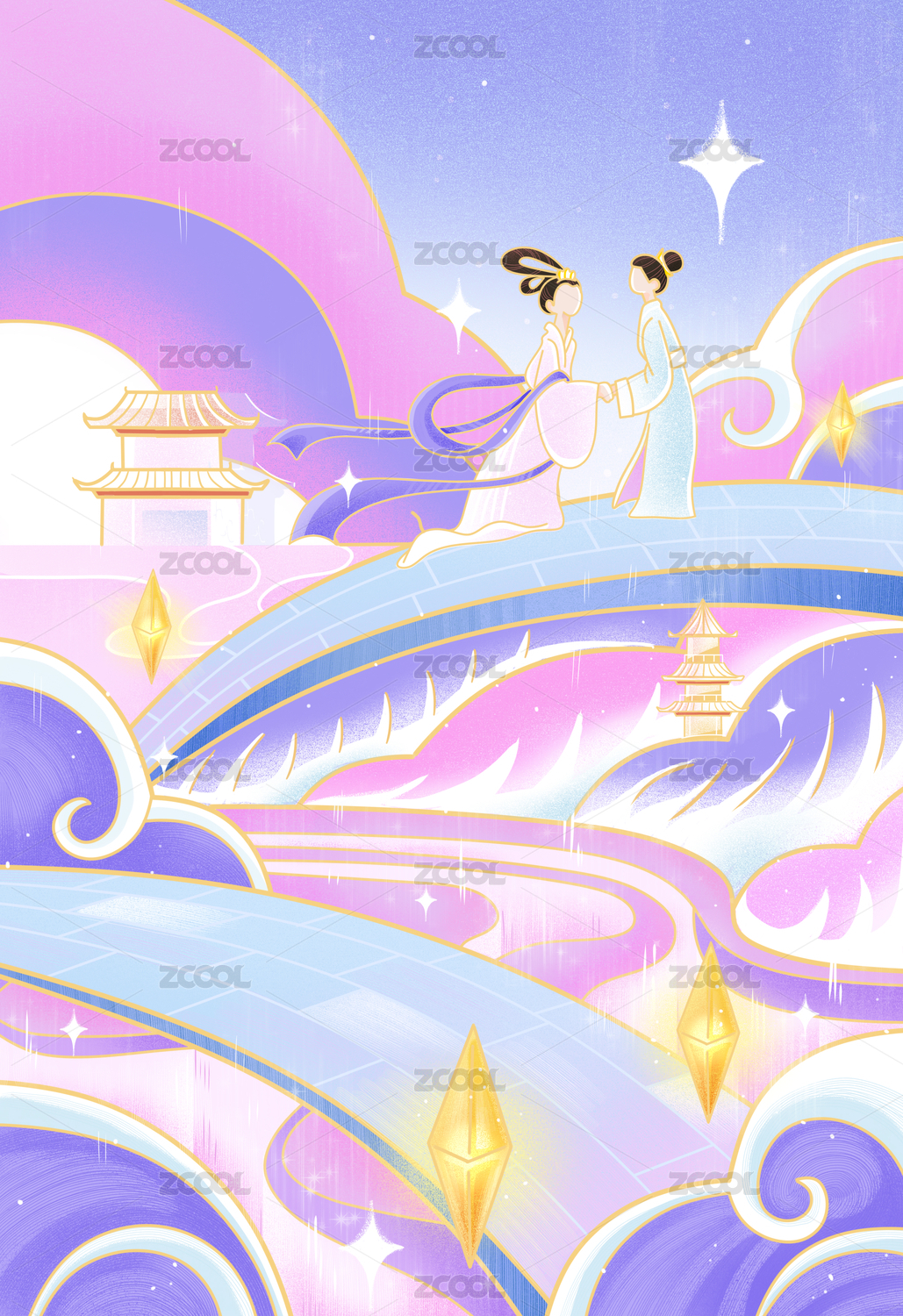 國潮七夕插畫牛郎織女鵲橋情人節(jié)